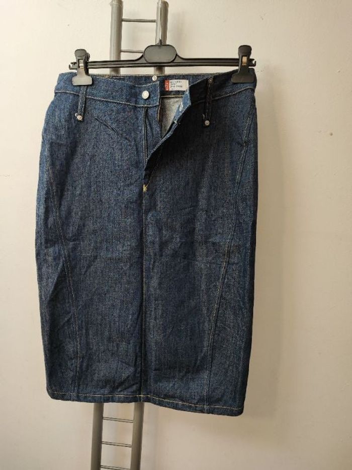 Superbe jupe jean femme Coupe droite Poches arrières Fente arrière Taille avec passants pour ceinture Taille S Coloris bleu brut