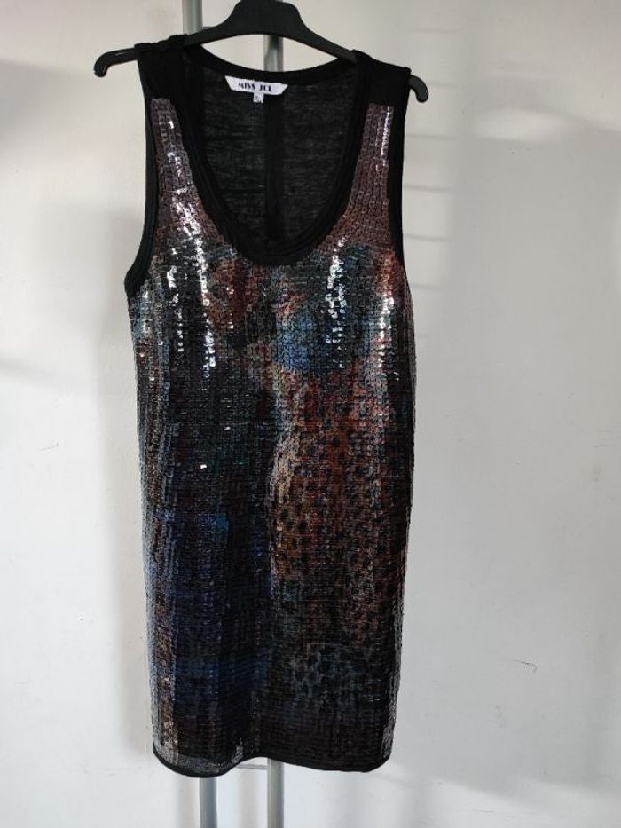 Belle robe femme Courte A l'avant imprimer sequins Arrière tissus fluide et lègere Avant coloré Arrière noir Taille S/M