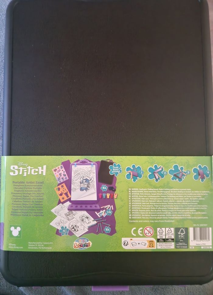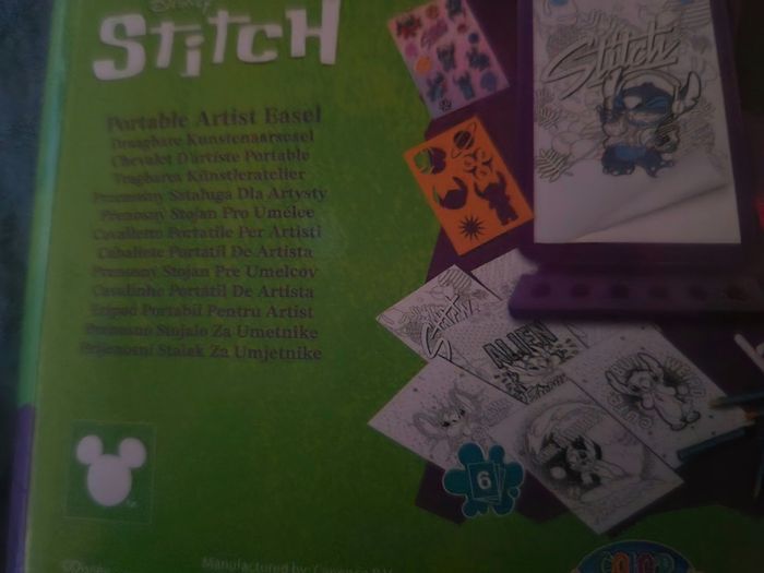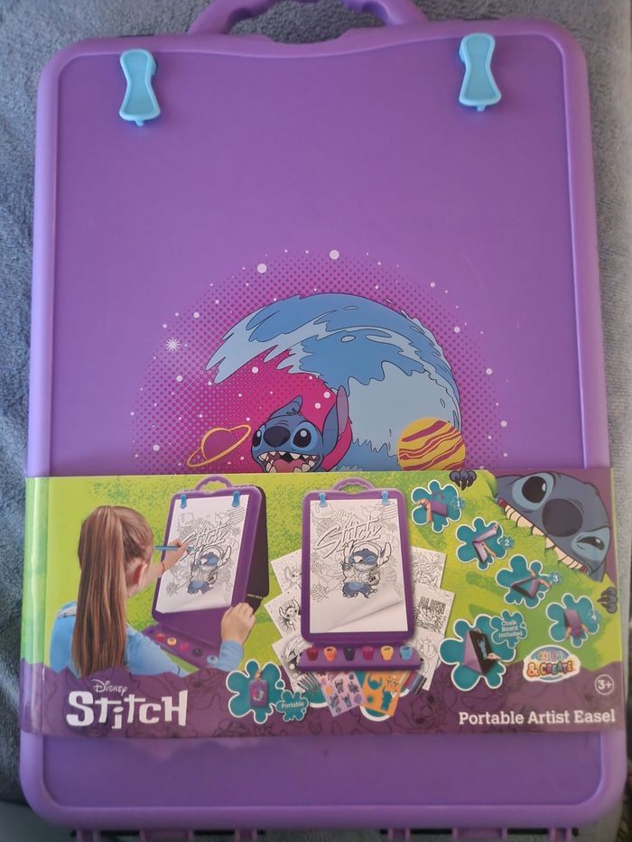 Neuf avec étiquette Chevalet d'artiste portable Stitch Disney. Coloriages Stitch Disney, Crayons pastels, Stickers autocollants, Pochoirs Stitch, Tampons Stitch, Craies de différentes couleurs. Tous les accessoires pour être un vrai artiste. Chevalet portable pour pouvoir l'enmener partout.