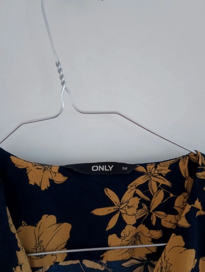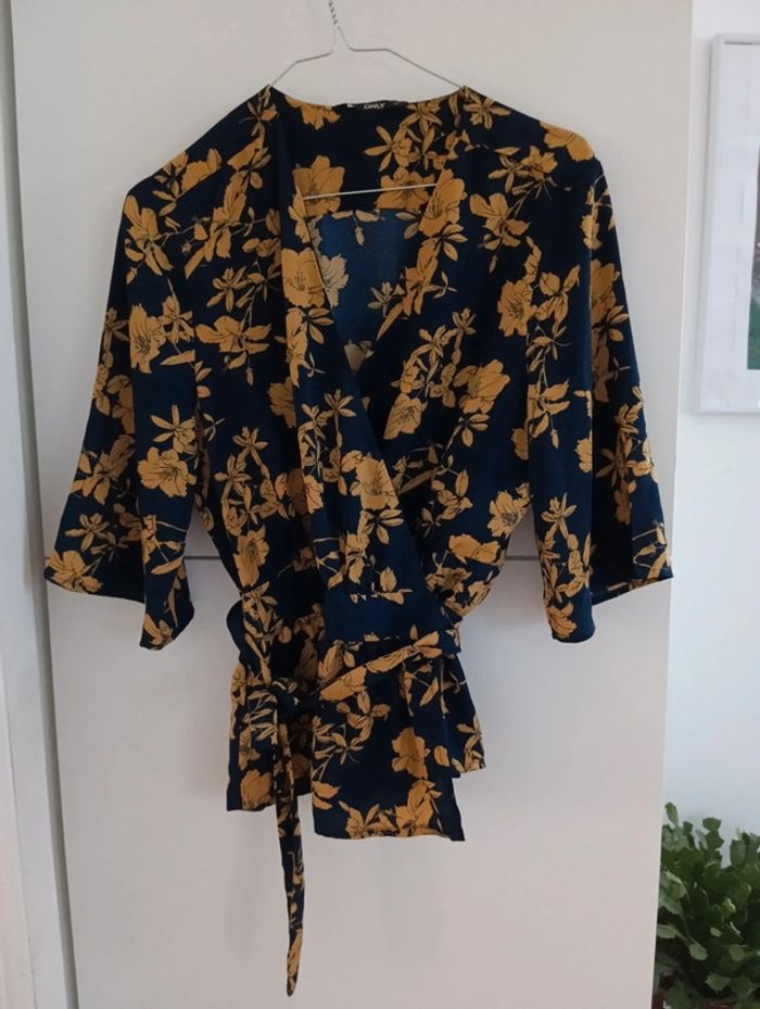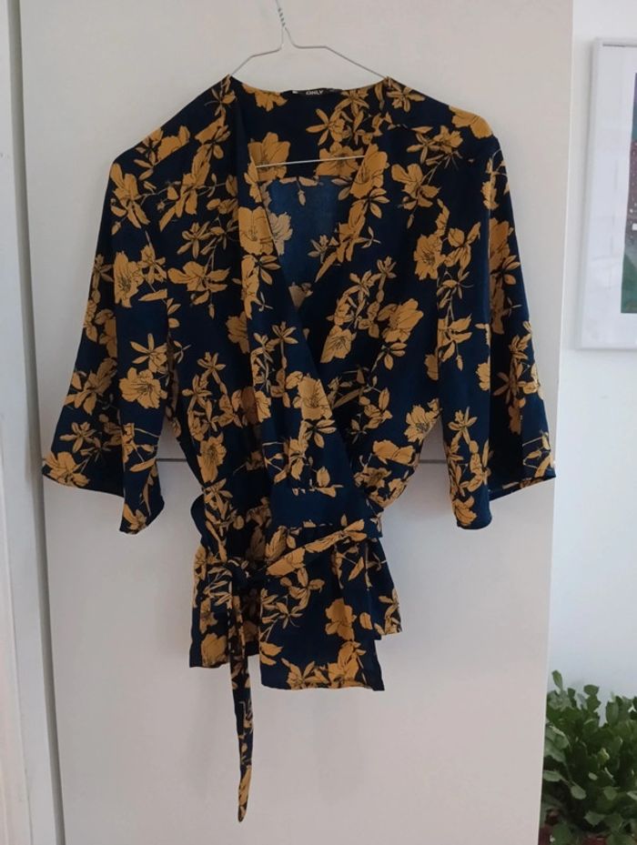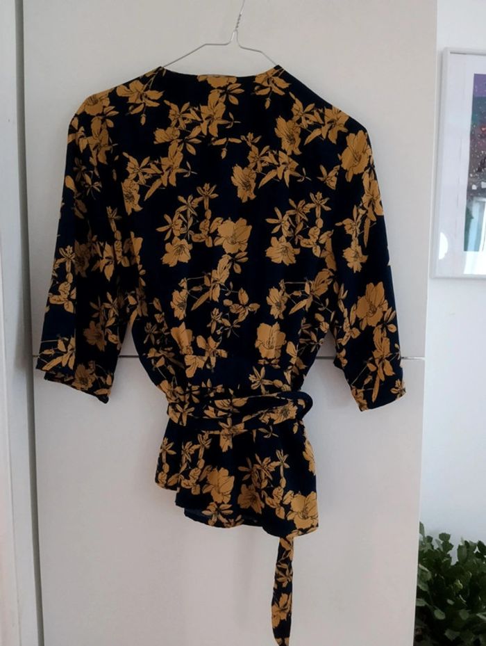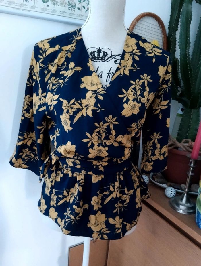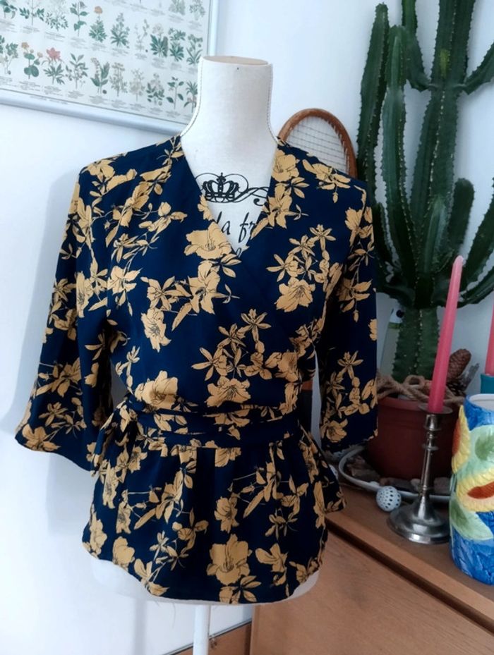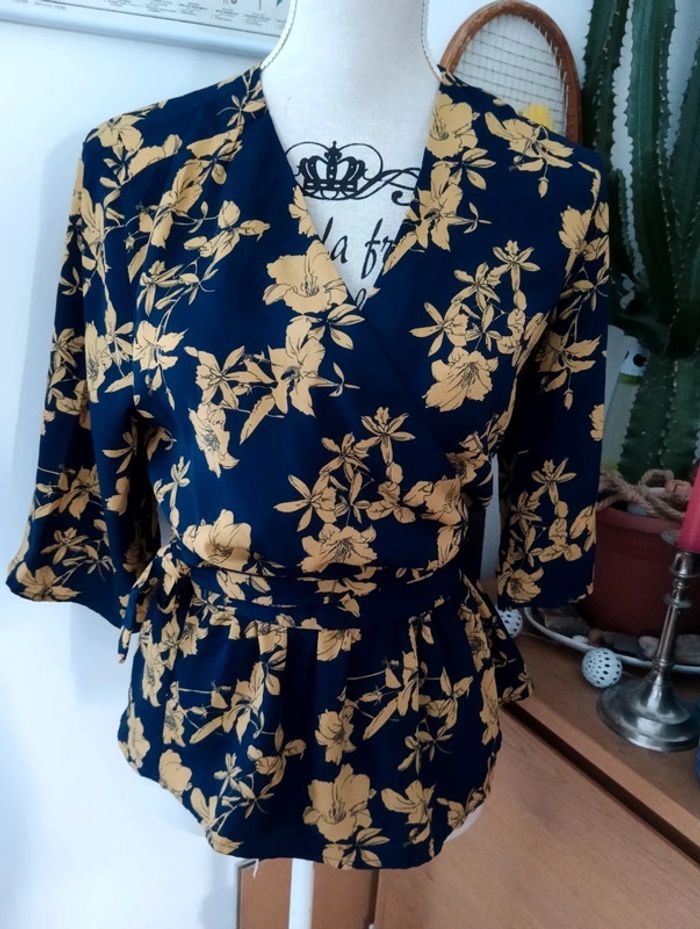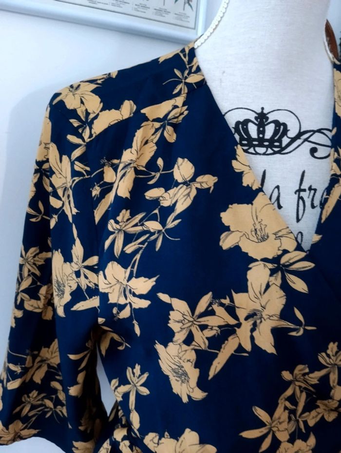 Blouse cache coeur Marine fleurs moutarde Manches 3/4 Taille 36 Pas d'indication de matière, peut être un mélange viscose polyester