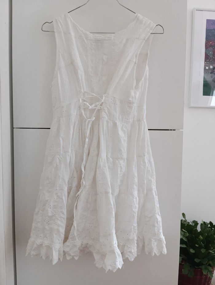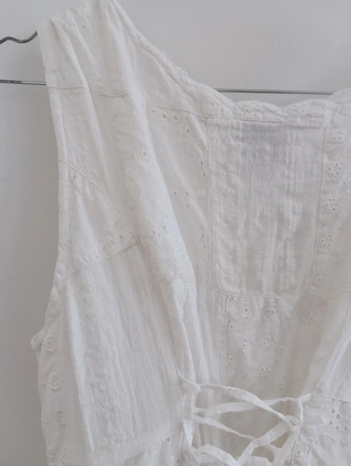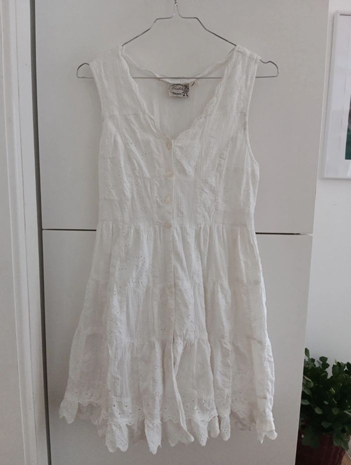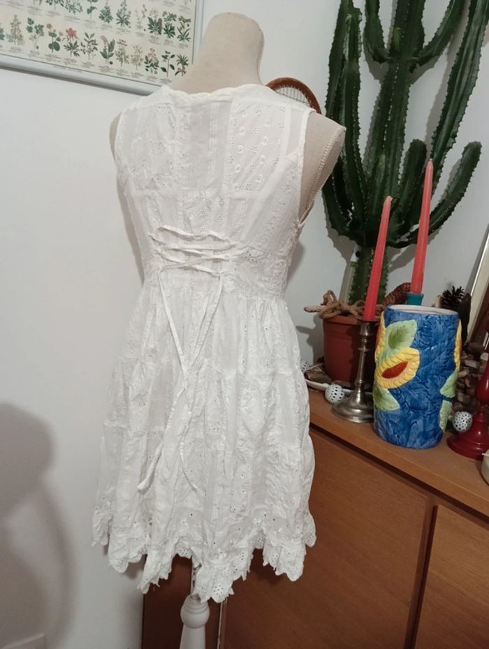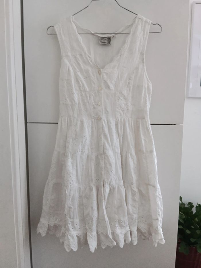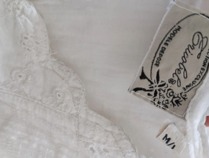 Mini Robe vintage tunique blanche patchs blanc et broderies. Entièrement Boutonnée Dos lacé à ajuster. Doublée 100% coton Taille 36/38 à confirmer avec les mesures Mesures Epaules 36cm Aisselles 43cm Taille 39cm Longueur 77cm