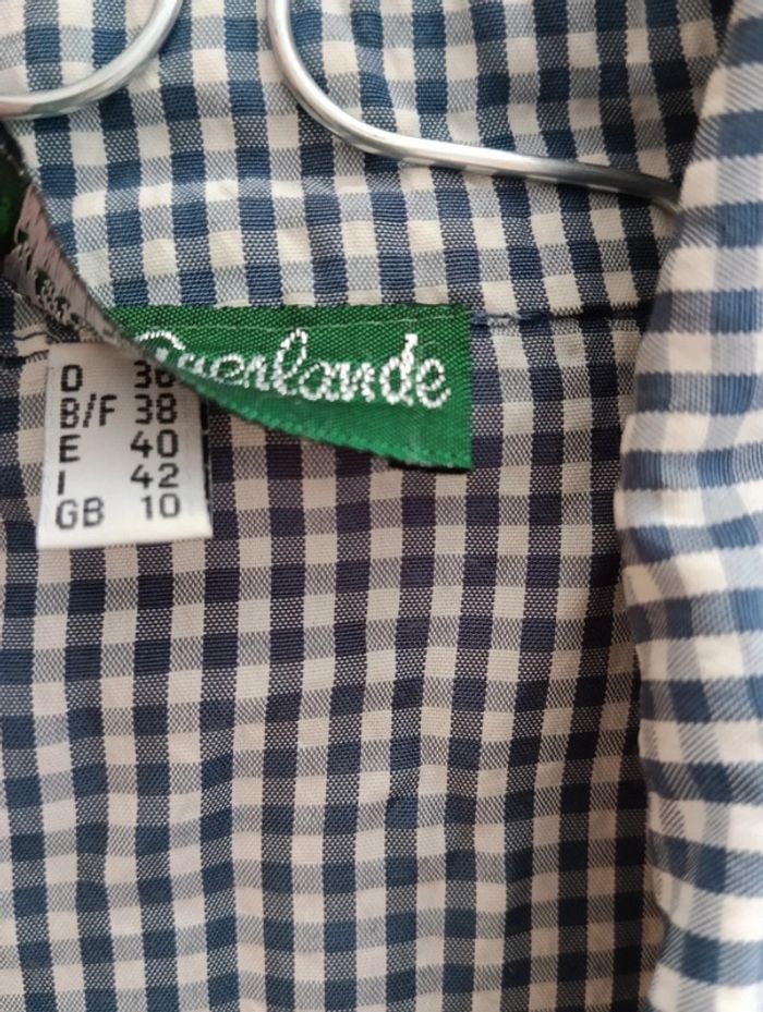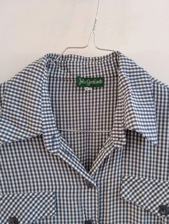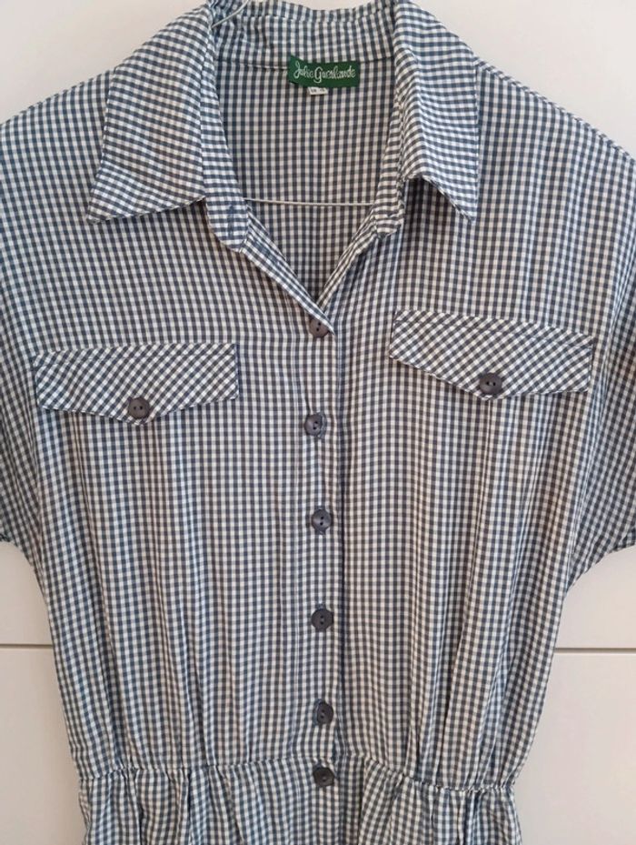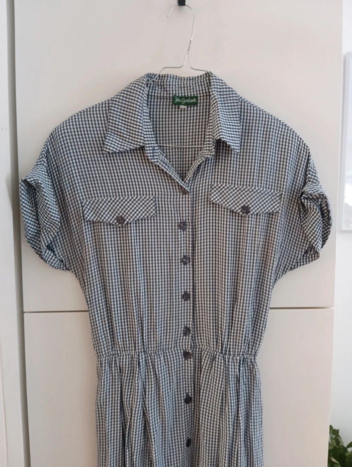 Robe vintage longue Made in Germany, Julie Guerlande Entièrement Boutonnée vichy bleu blanc, Passants à la taille mais pas de ceinture fournie. A épaulettes, taille 38 à confirmer avec les mesures Aisselles 50cm Taille extensible de 31 à 46cm Longueur 126cm Deux petits accros ont été réparés au bas de la robe (voir photos)