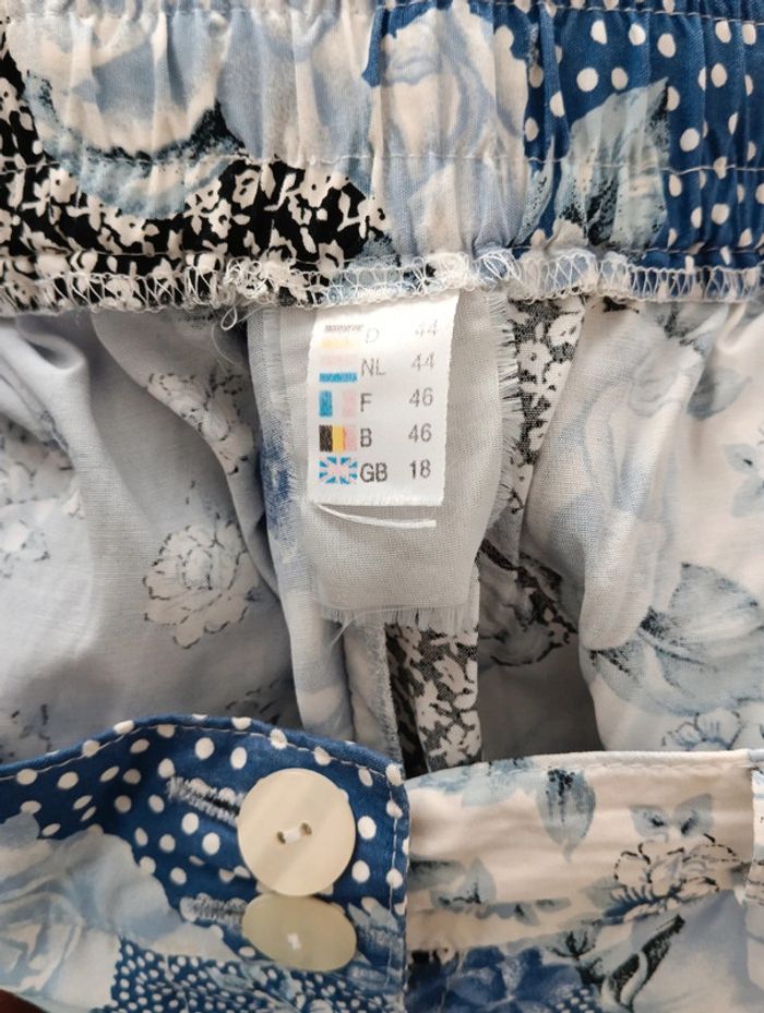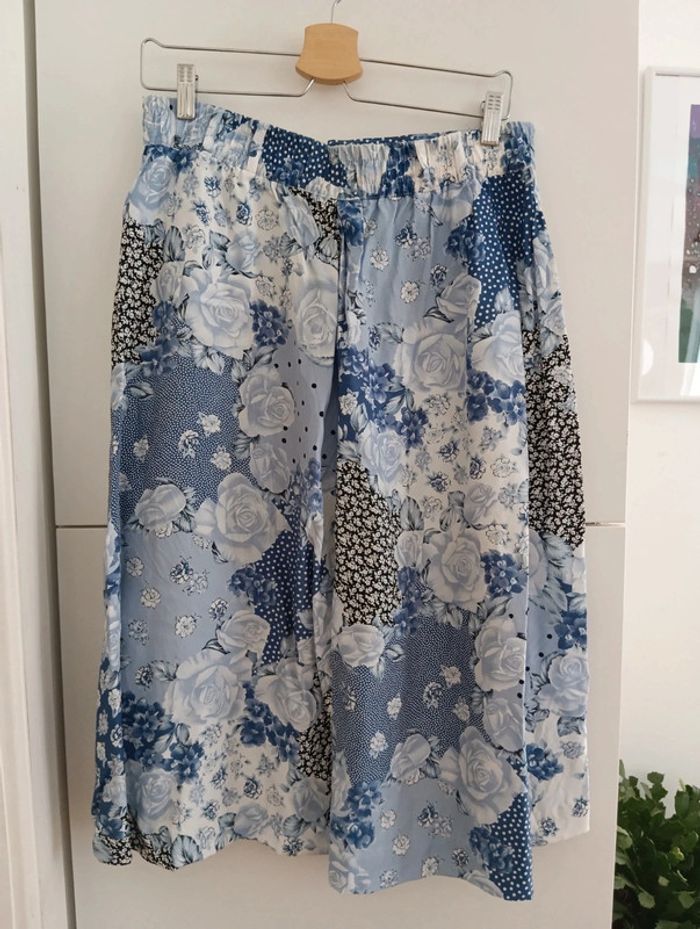 Jupe vintage imprimé patchwork bleu En viscose Taille 42 estimée à confirmer avec les mesures Taille élastique extensible de 39 à 45cm Longueur midi 72cm