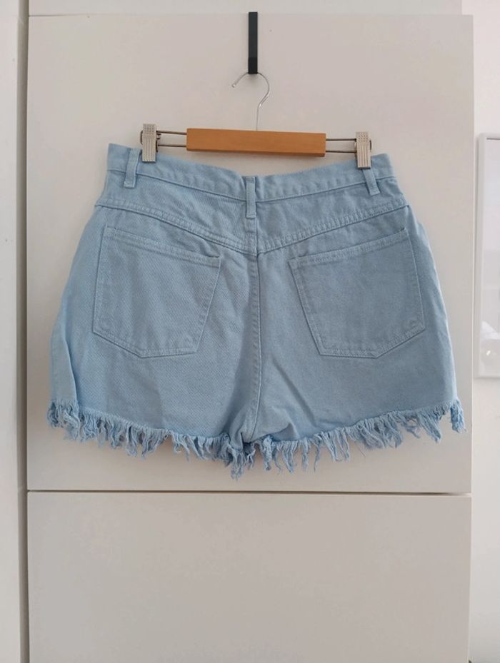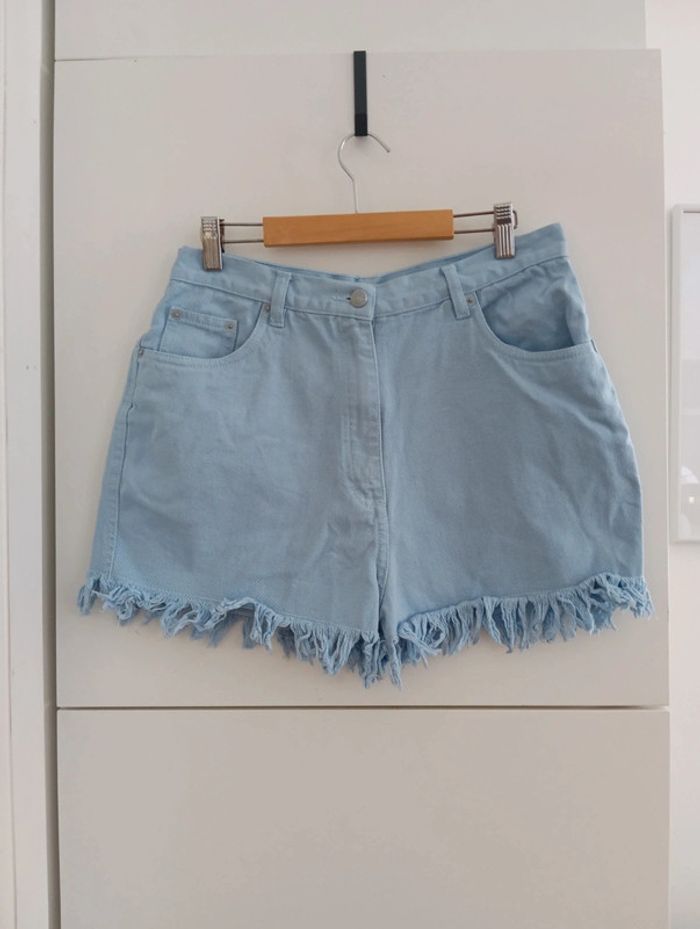 Short vintage bleu clair à franges 3 suisses le chouchou Taille 40 estimée à confirmer avec les mesures Taille 38cm De la taille à l'entrejambe 33cm Longueur 33cm