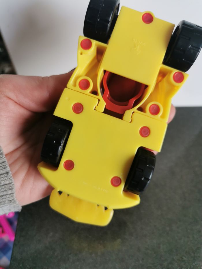 Voiture rouge Kinder flash comics, en plastique rouge, jaune et noir, en très bon état. Taille 13x6,5x4,5 cm, poids 66g.