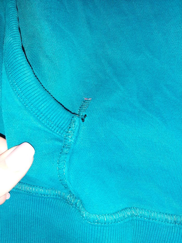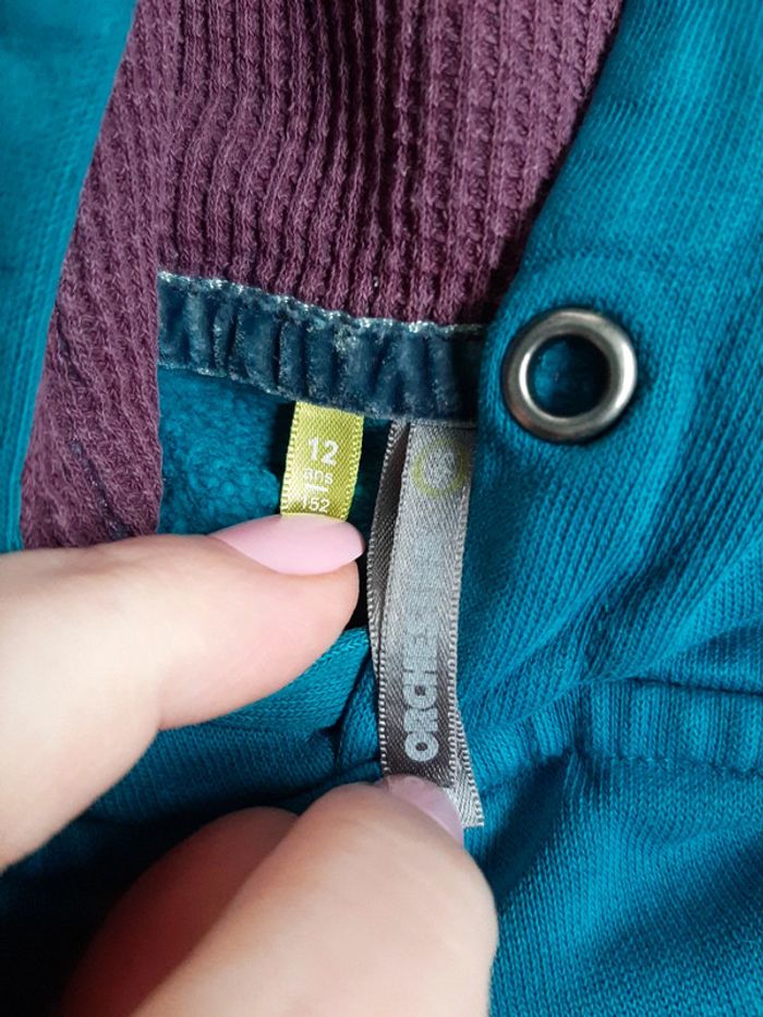 Pull orchestra à capuche Taille 12 ans Petit trou à la poche devant( voir photo) Couleur bleu/ vert A été porte Pas de cordon à la capuche, je sais plus si il y en avais Envoi uniquement mondial relais