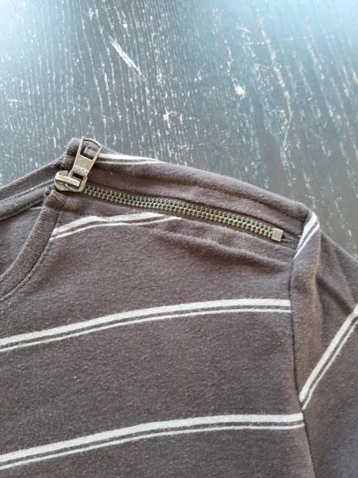 Polo avec zip sur une épaule en larron et rayure grise En taille M De chez kiabi A été porte