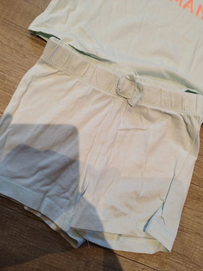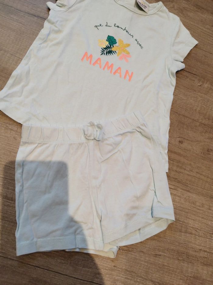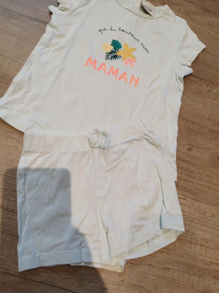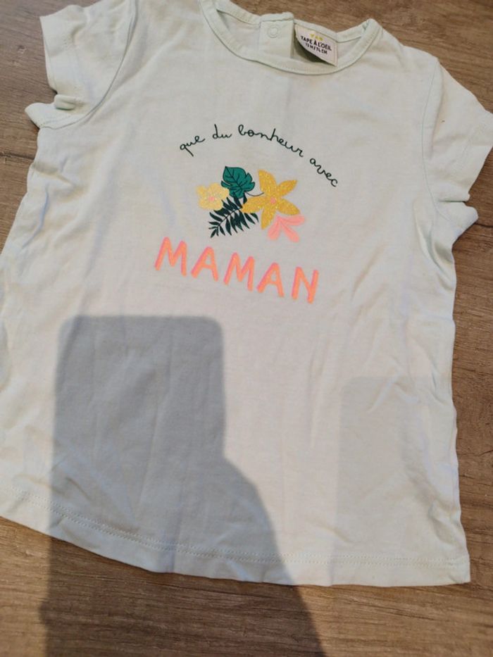 Ensemble été fille taille 1 an t-shirt manches courtes et short été marque tape à l'oeil t-shirt que du bonheur avec maman fleur couleur bleu vert Très bon état Réduction sur les lots activé #reductionsurleslots #pascher #urgent