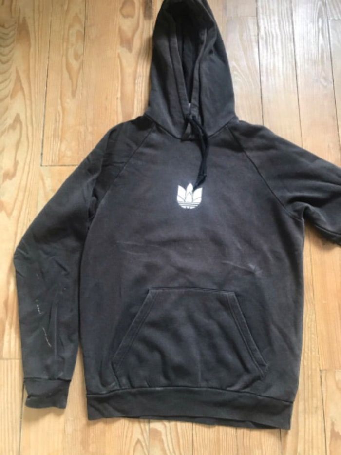 Sweat à capuche Adidas Le noir est un peu délavé Des taches sont apparues sur un bras et sur le derrière de la capuche ( voir photo 2 et 3)