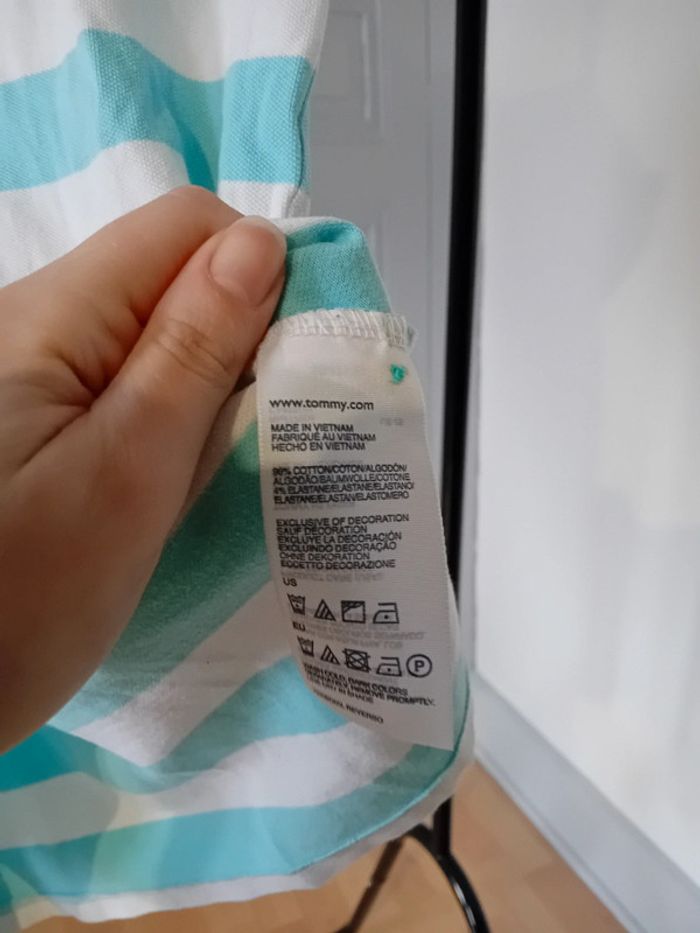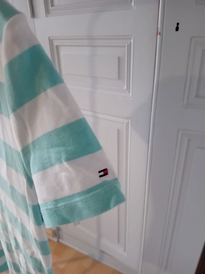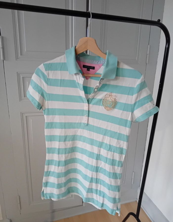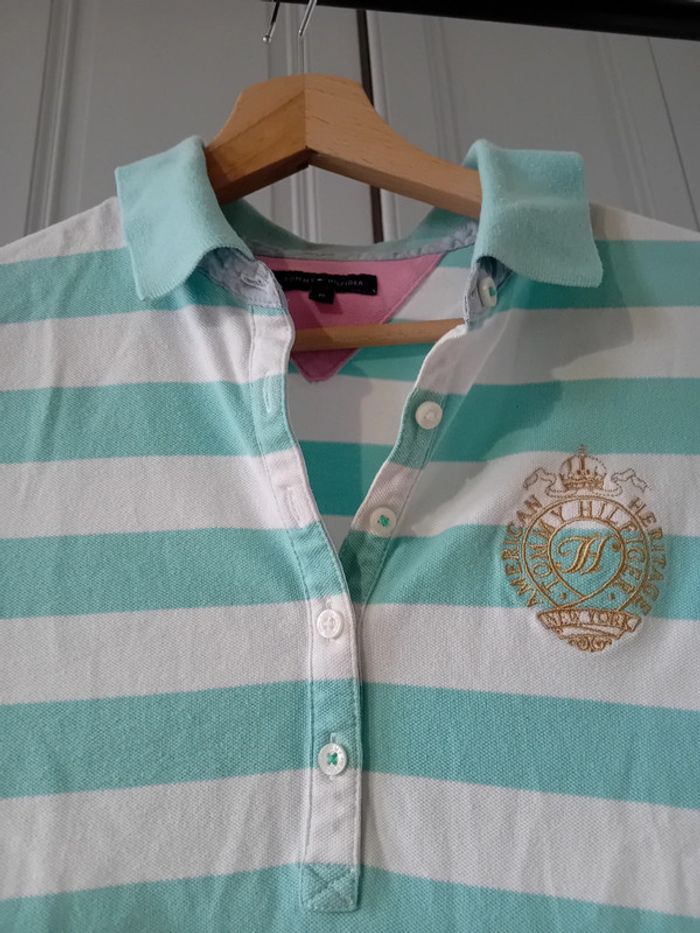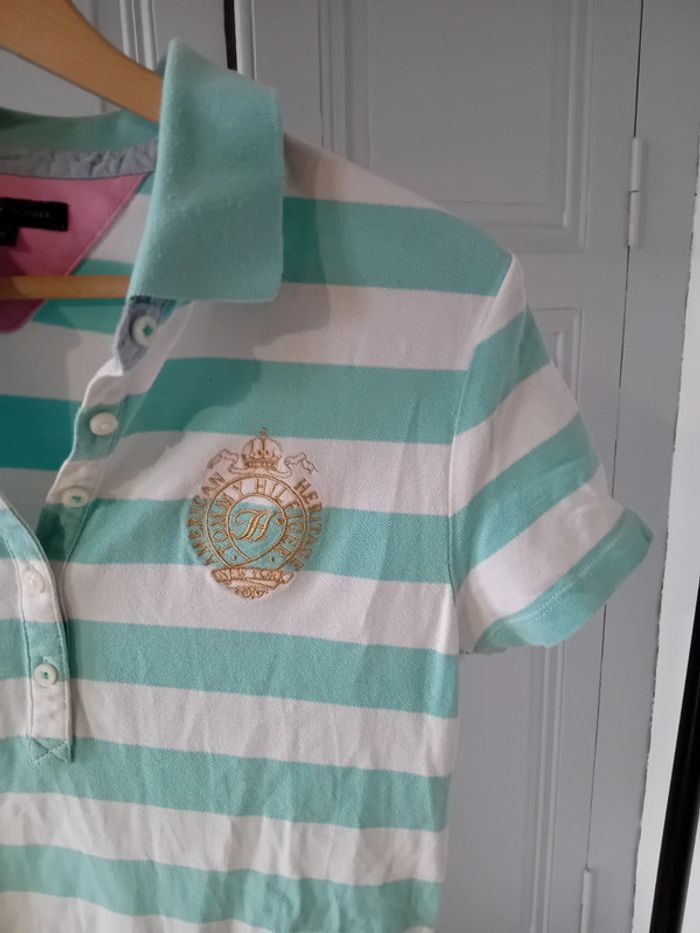 • Polo ajusté manches courtes, à rayures blanches et menthe, taille M. Logo doré au niveau de la poitrine, bouton de remplacement en plus. • Dimensions: longueur 65 cm, aisselle 40 cm, épaule 42 cm. Bon état (sans taches ni trous). • Envoi rapide et soigné #tommy #tommyhilfiger #tommygilfigerfemme #polotommyhilfiger #polotommyhilfigerfemme #maelyatm