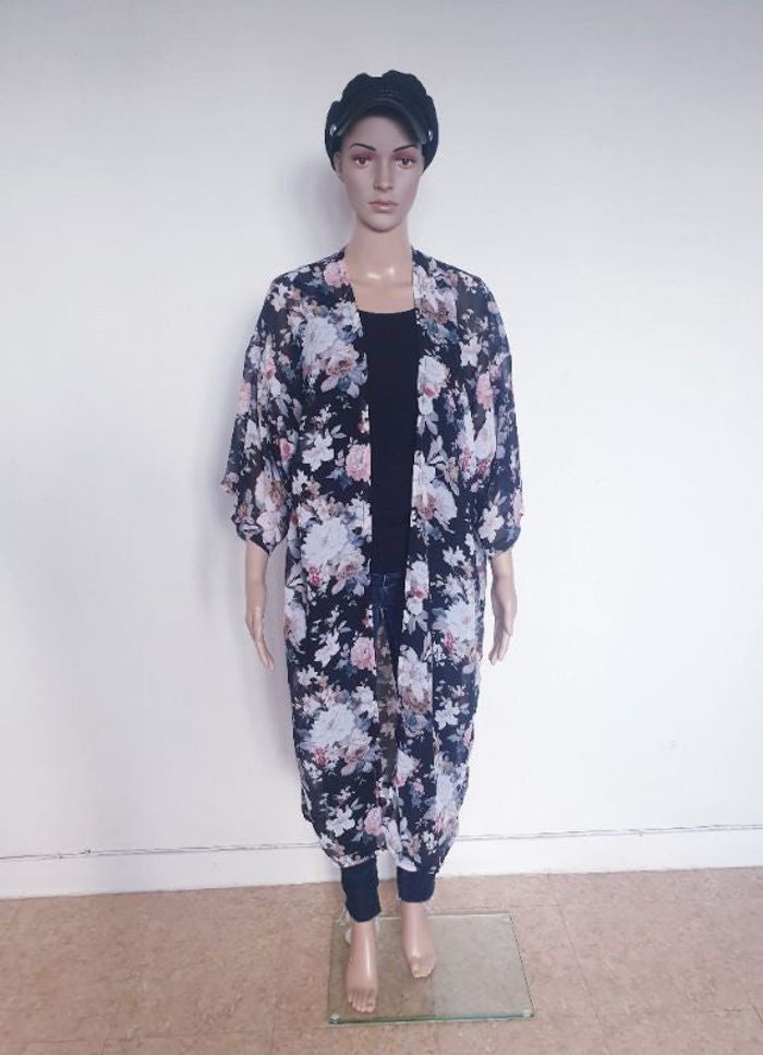 🎀 Kimono fleuri long 🎀 Voile léger et transparent 🎀 Taille unique 🎀 Quelques mesures: aisselle à aisselle à plat 50cm, taille à plat 38cm, longueur 100cm 🎀 Très bon état 🎀 Réductions sur lots activées