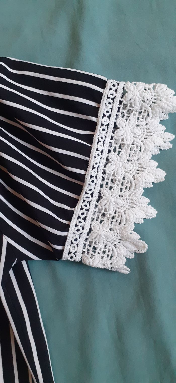 Vends une tunique 95 % polyester, dentelle sur les manches, couleur noire avec rayures blanches, taille 40. Longueur sous aisselle : 48 cm.