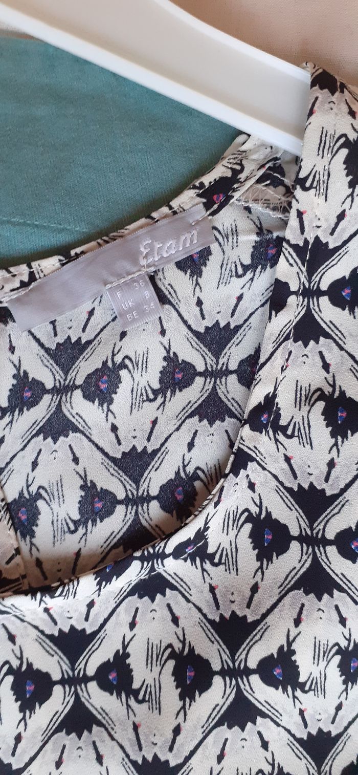 Vends une robe en tissu synthétique léger, sans manche, ouverte dans le dos, fermeture sur le côté, pan arrondi et plus long dans le dos, marque Etam, taille 36. Longueur devant : 73 cm Longueur dans le dos : 95 cm.