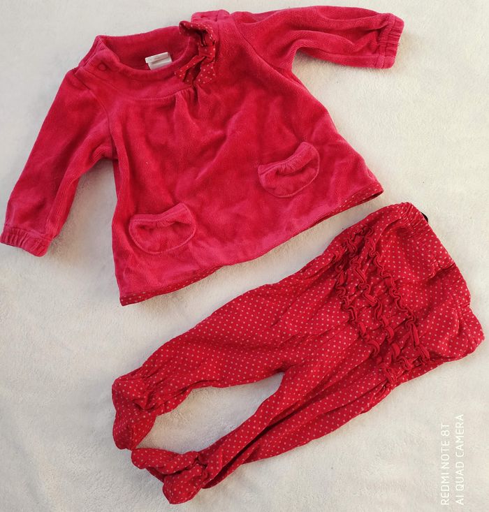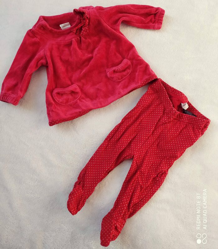 En bon état ( porté plusieurs fois), taille 56cm 1-2 mois ( soit du 3 mois) Joli ensemble rouge composé d'un haut manches longues epais ( fermeture pressions dos), et d'un legging à pieds en coton imprimé à pois avec froufrous aux fesses N'hésitez pas si vous avez des questions.