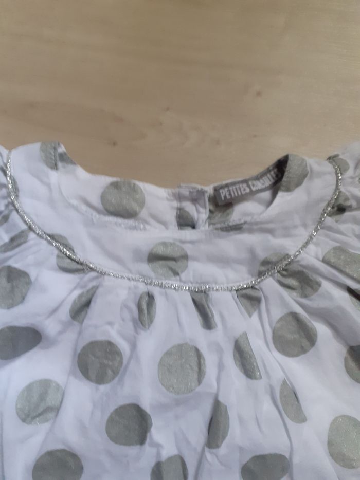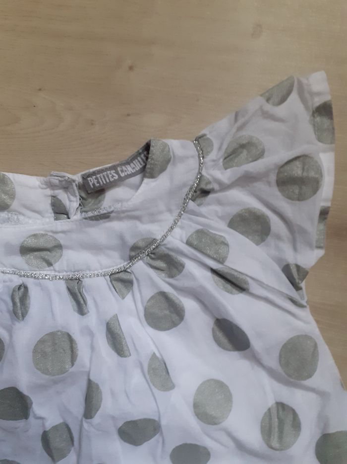 Lot t-shirt marque petites canailles blanc à poids gris avec tulle et son gilet gris taille 6 mois en très bon état