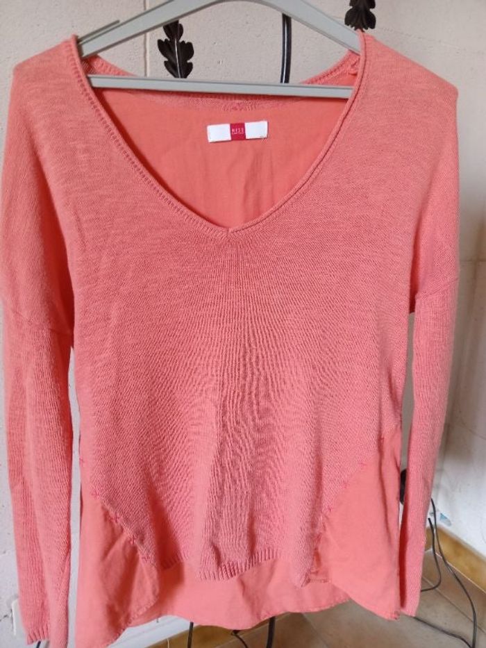 Pull devant. Pull court derrière doublé sur une chemise Col V Couleur corail Taille 0