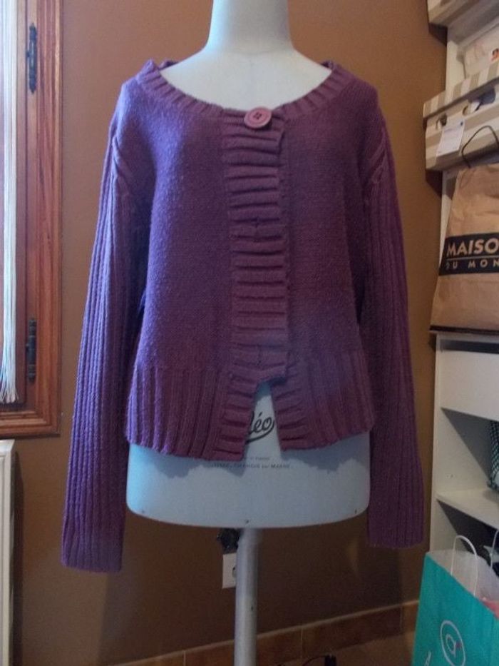 épaisse et chaude, larges cotes manches+dos, encolure échancrée, 3 gros boutons, taille grand.