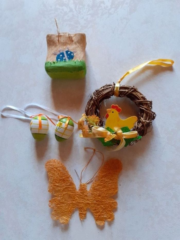 A suspendre: 2 œufs, 1 couronne avec poule, 1 papillon orange. 1 mini panier en papier mâché L'ensemble en très bon état, neuf pour certains
