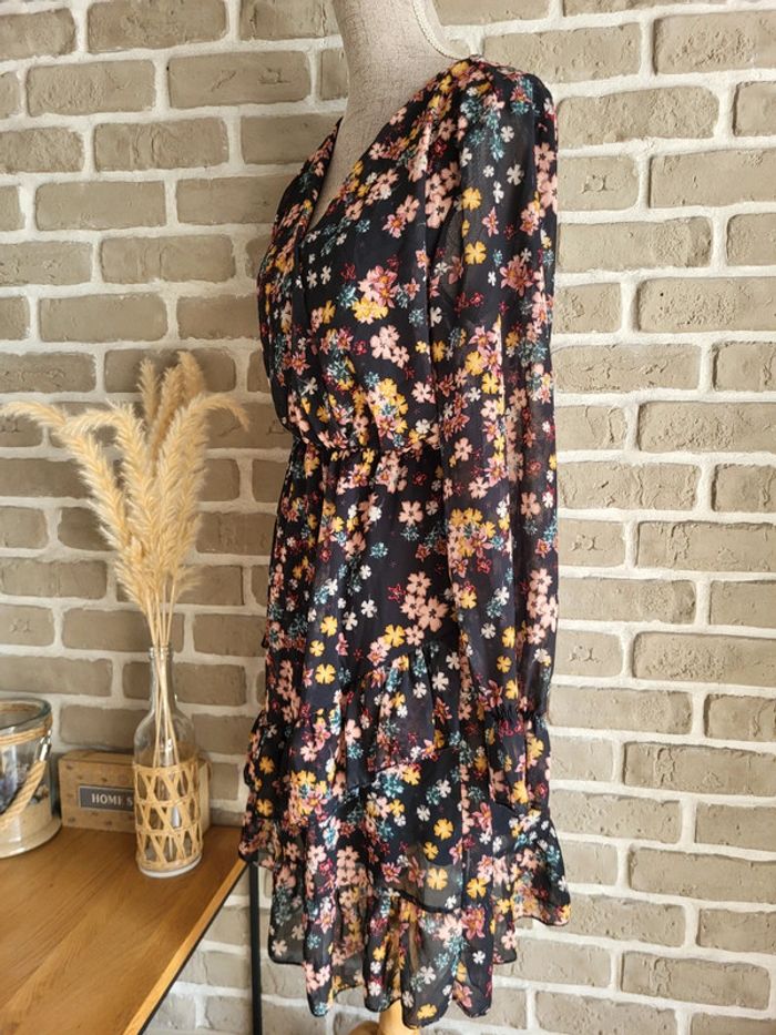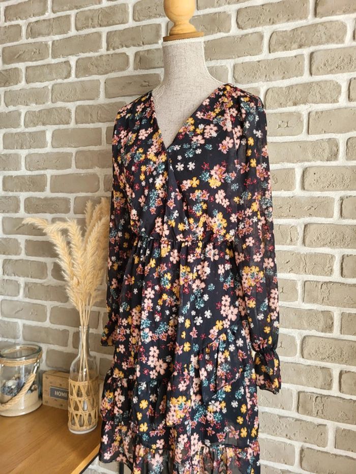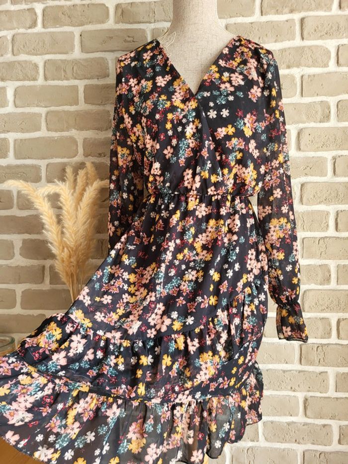 💝 Bénéficiez d'une réduction en créant lot dans mon dressing 🛍️ 🌸 Charmante robe New Collection, en bon état Petite imperfection (fils blancs) visible sur la photo 3 mais qui passe inaperçu porté 🎀 Voile léger et fluide fleuri sur fond noir Doublé sauf aux manches et le dernier volant de la jupe pour plus de légèreté 🪷 Coupe ample et évasée avec taille élastique Décolleté croisé forme cache-cœur Doublé volants en bas de la jupe et aux poignets 🍥 Taille Unique, elle s'adapte à toutes les morphologies et convient à du S 36 au L 40 Longueur : 85 cm 🩷 Un style léger et romantique à porter avec des sandales en journée et des compensées pour la soirée