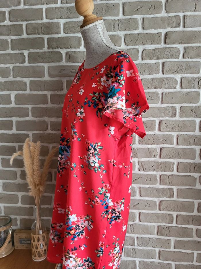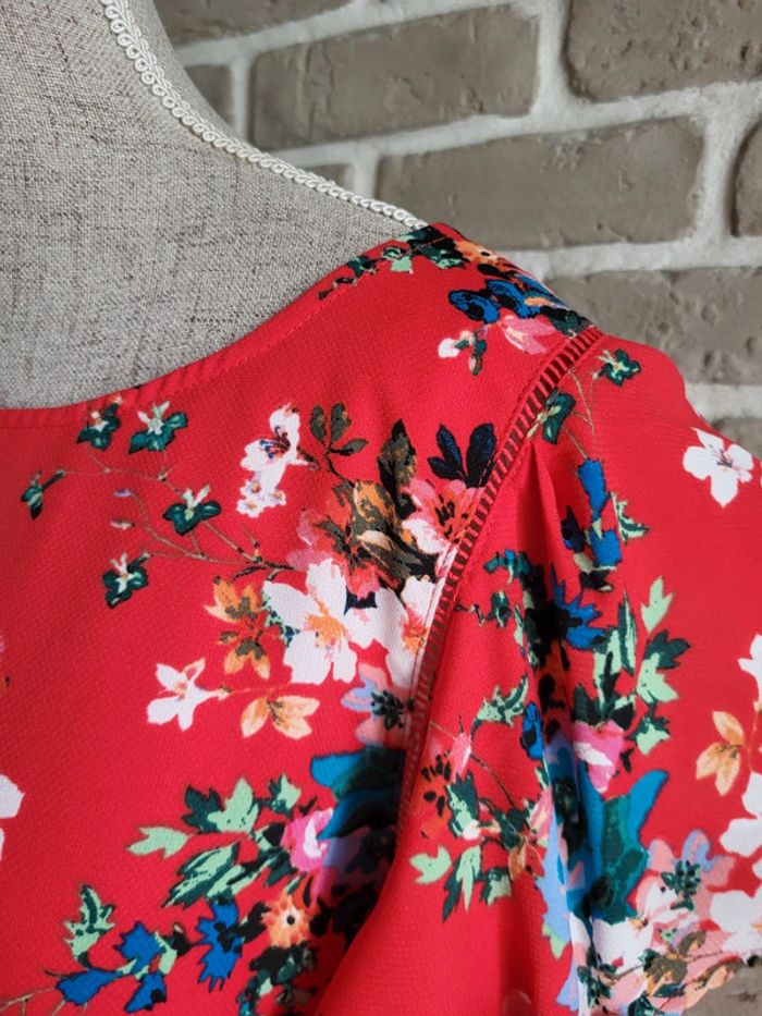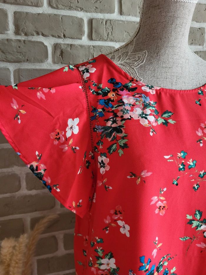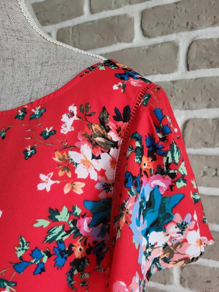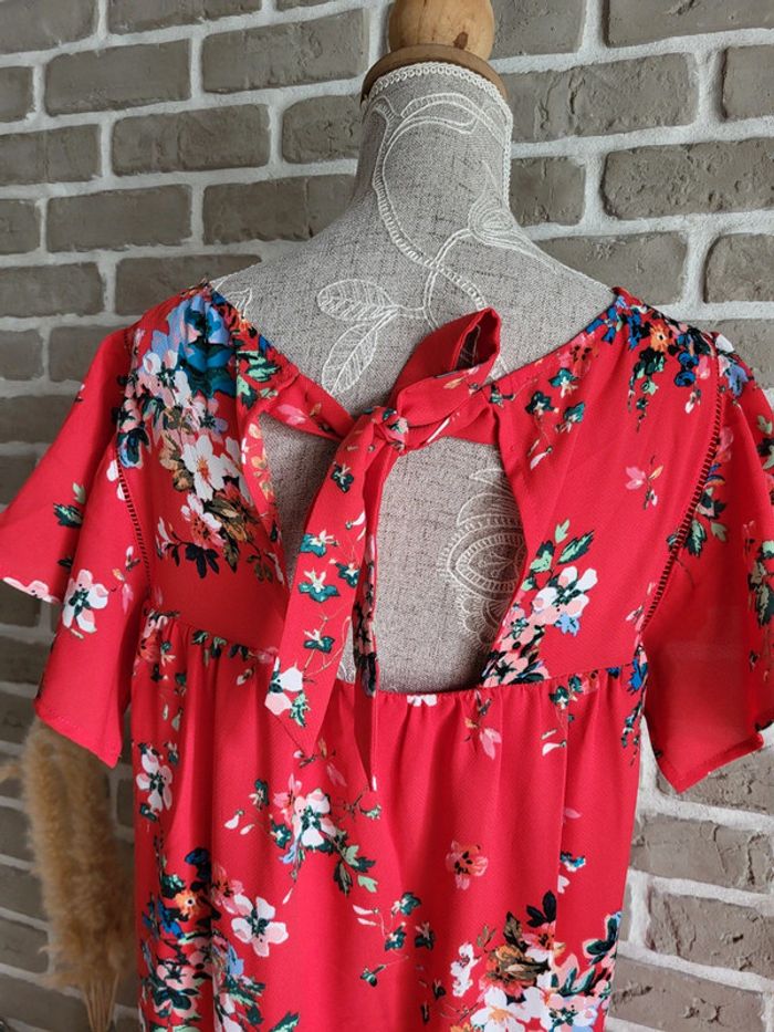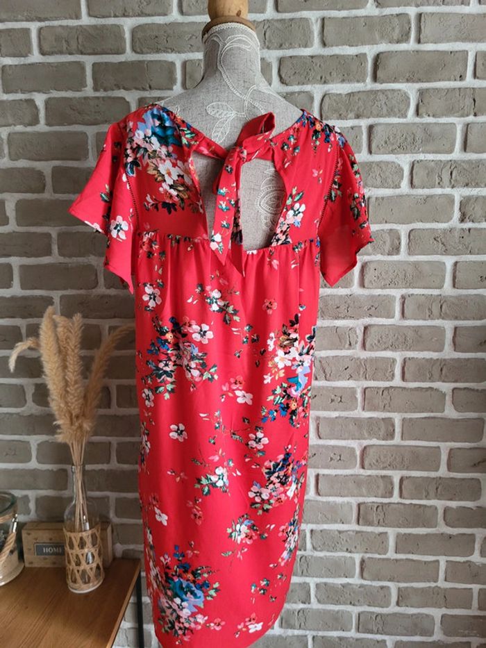 💝 Bénéficiez d'unet réduction en créant lot dans mon dressing 🛍️ 🌸 Jolie robe d'été Promod en très bon état 🎀 Tissu fluide imprimé bouquet de fleurs sur fond rouge Doublé (sauf manches) 🪷 Coupe ample, petites manches papillon Ouverture en goutte d'eau dans le dos avec un lien à nouer dans la nuque 🍥 Taille M 38 🩷 Portez-la avec des sandales dorées et une pochette en osier pour une tenue estivale simple mais élégante