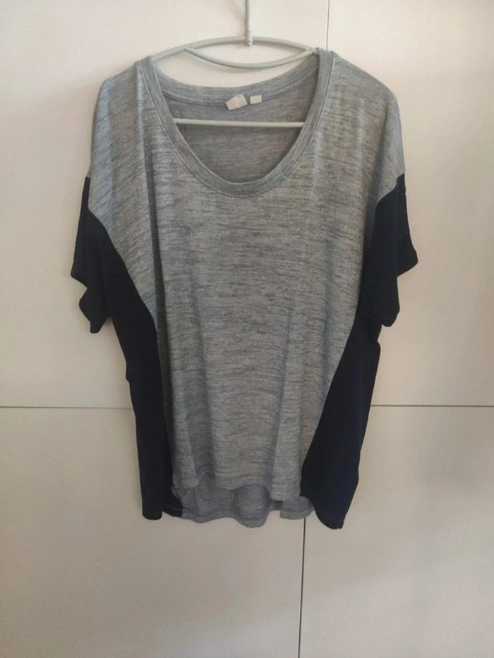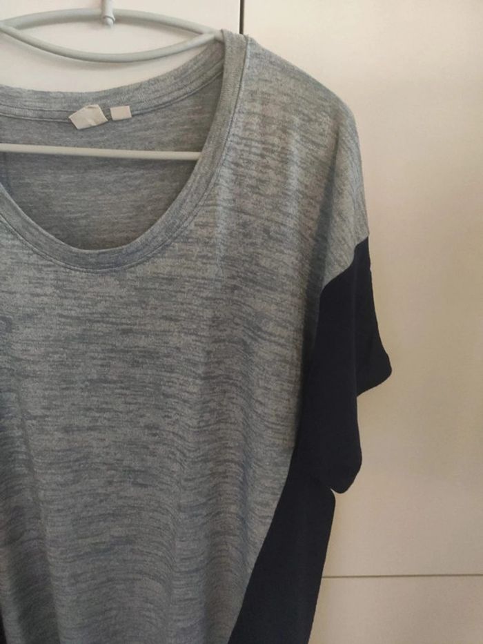 Tee shirt bleu gris chiné et extrémités bleu marine. Large encolure. Fluide, très agréable à porter. Acheté dans un magasin Gap, taille M, bon état #vulariFemmesM38 #vulariGap