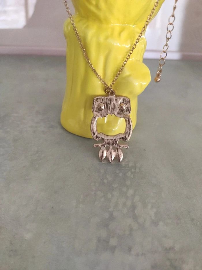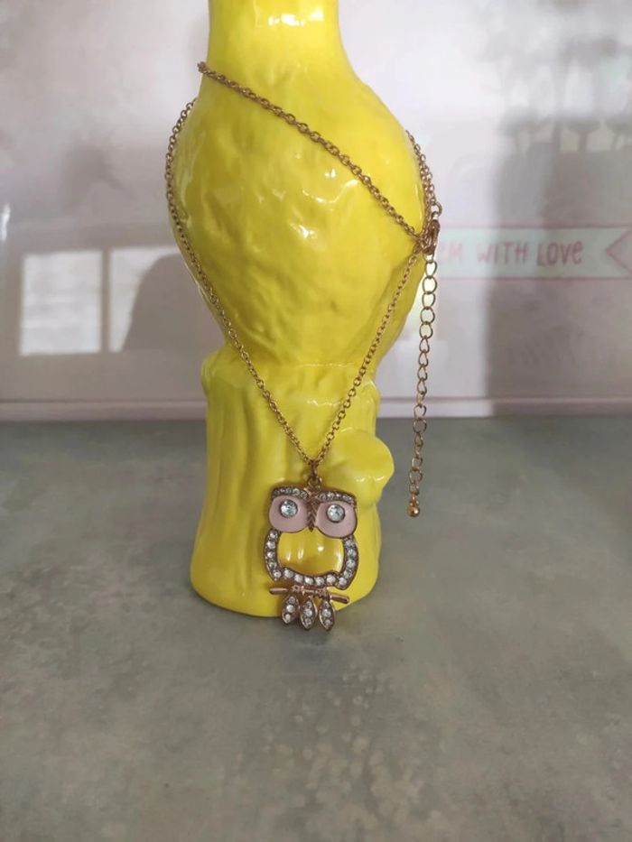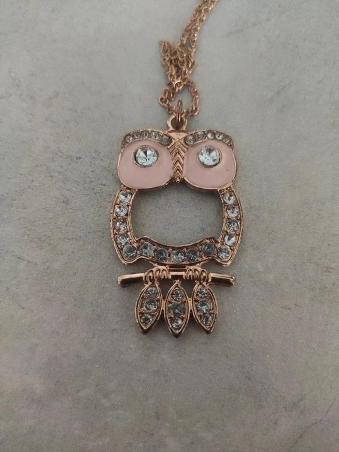Peu ou même pas mis.... Chouette de 4 cm de hauteur. Collier couleur golden rose, yeux de la chouette rose et strass. Parfait état. Je ne connais pas la matière. #vulariBijoux