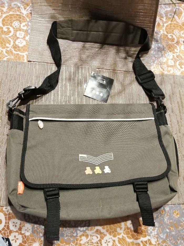 Cartable/sacoche en bandoulière Lulu Castagnette, kaki, anse réglable des 2 côtés, poches devant, arrière, grand rabat, extension de la base de 7cm. Longueur 37 cm Hauteur 25 cm Épaisseur 11 cm, 18 cm avec l'extension. À été recousu à l'intérieur, voir dernière photo. Bon état.