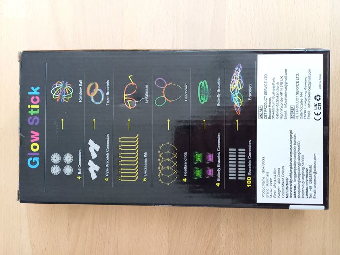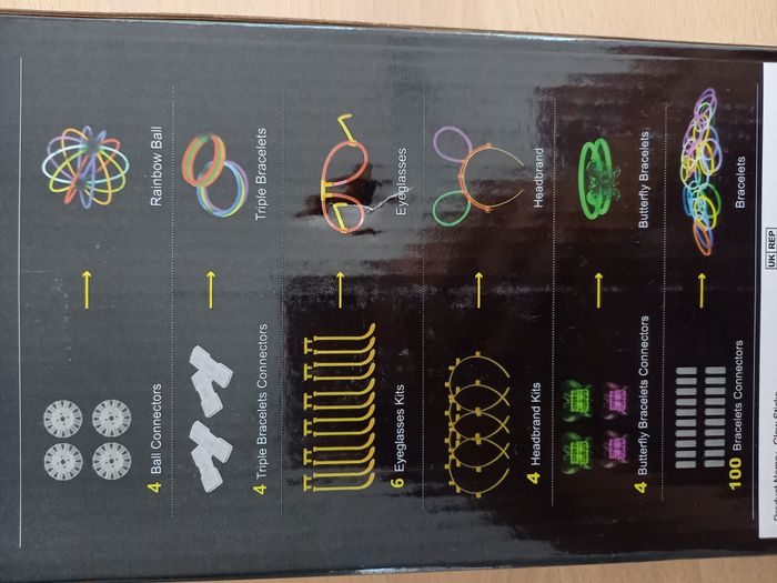 Accessoires pour bracelets phosphorescents / bâtons lumineux. Idéal pour les fêtes, EVJF / mariage / anniversaires,... Ils sont neufs, j'ai utilisé les bâtonnets lumineux mais pas les accessoires Ces astucieux accessoires vous permettront de créer: 🔆 2 balles / sphères phosphorescentes 👓​ 6 paires de lunettes phosphorescentes ⭐ 4 bracelets triples 💞​ 4 serre-têtes rigolos (ils n'ont pas tous exactement la même forme mais sont bien neufs, visible sur les photos détaillées) 🦋​ 4 bracelets doubles papillons 🚨​ Les bâtons phosphorescents ne sont pas fournis Expédition rapide et soignée!