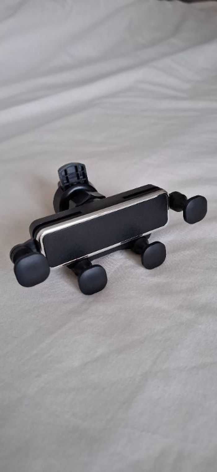 Avec pince pour se fixer à la grille d'aération. Orientation réglable. S'adapte à la taille du téléphone.