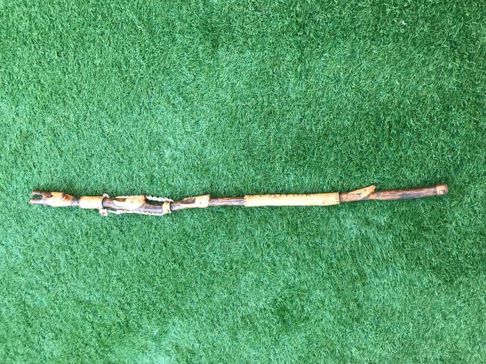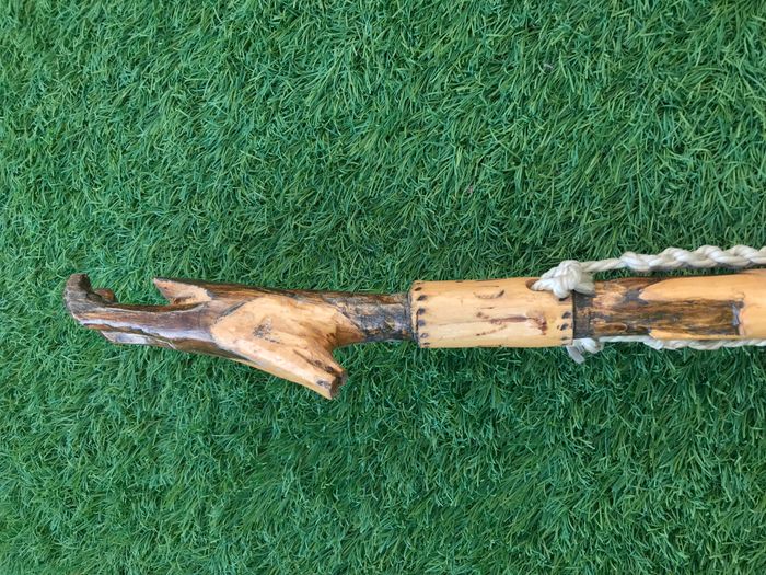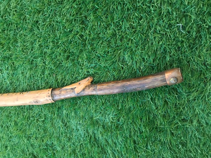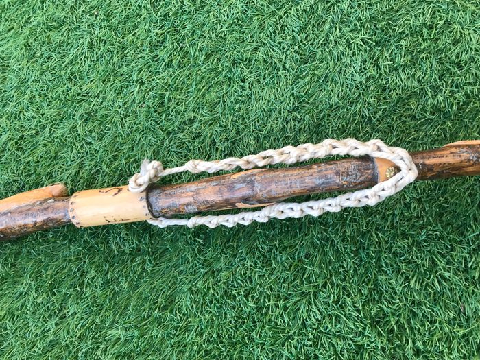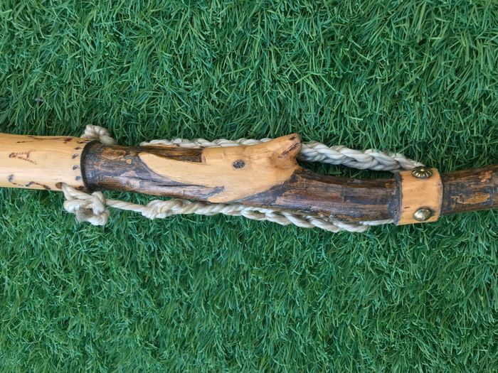 (article vendu en l' état, état d' usage voir toutes les photos) Bâton de marche Tête de chamois Bois sculpté et gravé Savoie Valloire Dragonne en corde Férule cuivrée Longueur : 1m16 Poids : 540grs