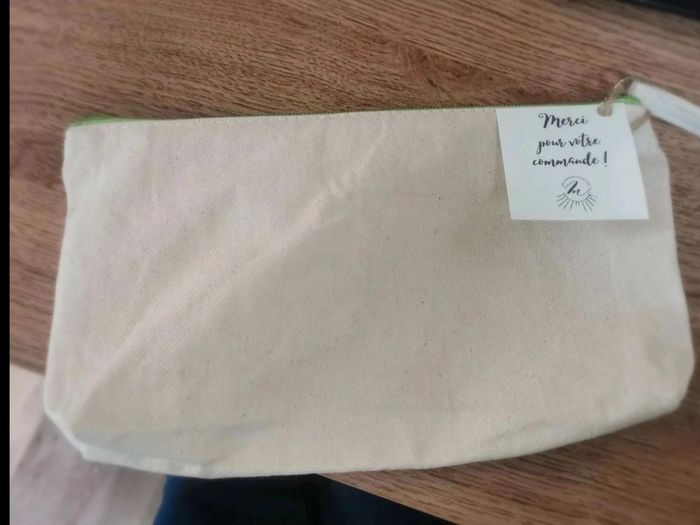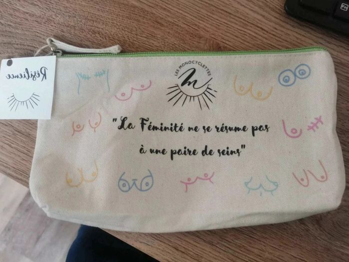 Pochette en tissu beige et zip vert avec inscription "la féminité ne se résume pas à une paire de seins" 22x12cm environ Les Monocyclettes Neuve #mabiquette10accessoires