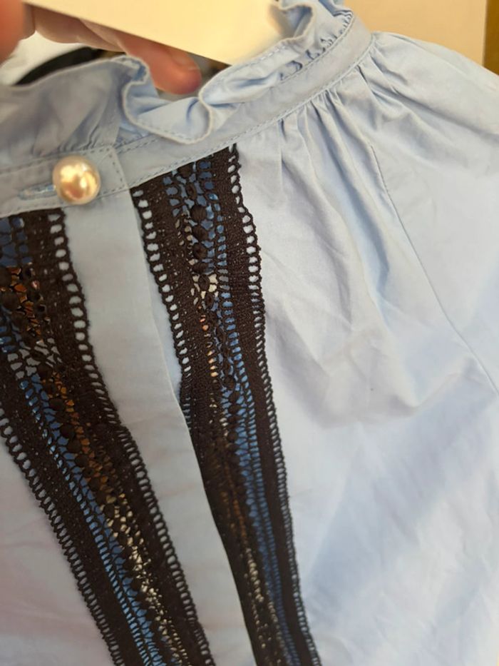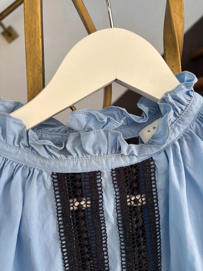 Blouse bleu ciel Sandro avec dentelle au centre noir Perle dans le dos pour fermer la blouse Bon état (un petit défaut à peine perceptible cf dernière photo) Taille 0 (34/36) #blouse #chemisier #sandro #dentelle #bleu #sandroparis Blouse donkerblauw of zwart, kanten details. Blusa azul oscuro o negra, detalles de encaje. Blusa blu scuro o nera, dettagli in pizzo. Blusa azul escuro ou preta, detalhes em renda. Blús dúghorm nó dubh, sonraí lása. Dark blue or black blouse, lace details. Dunkelblaue oder schwarze Bluse, Spitzendetails.