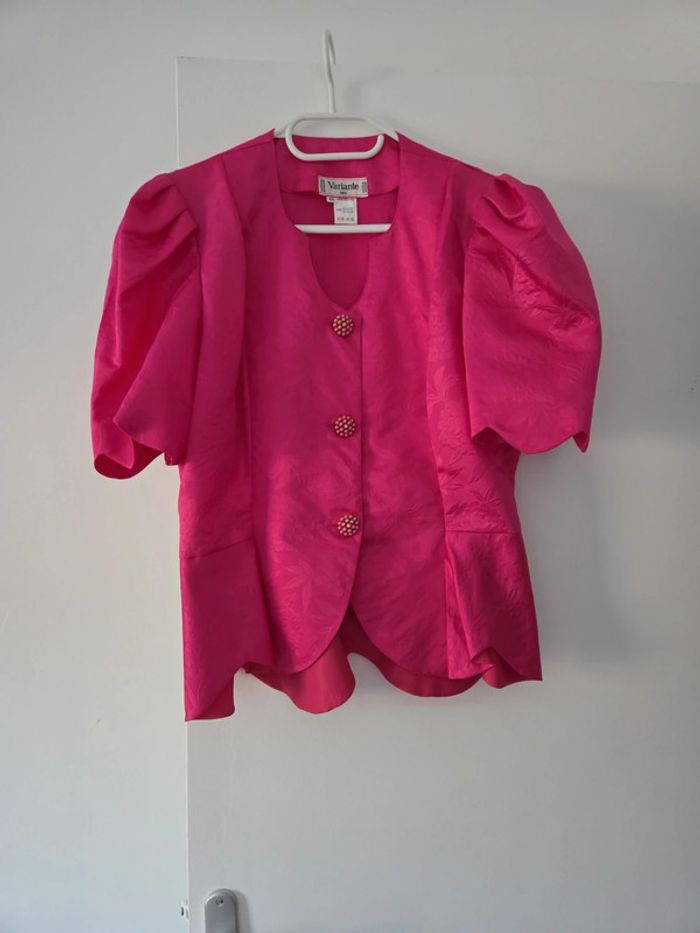 Ensemble 2 pièces tailleur femme avec chemisier manche courte avec épaulettes rose, jupe en dessous du genou droite. Taille 46, très bon état. Made in France