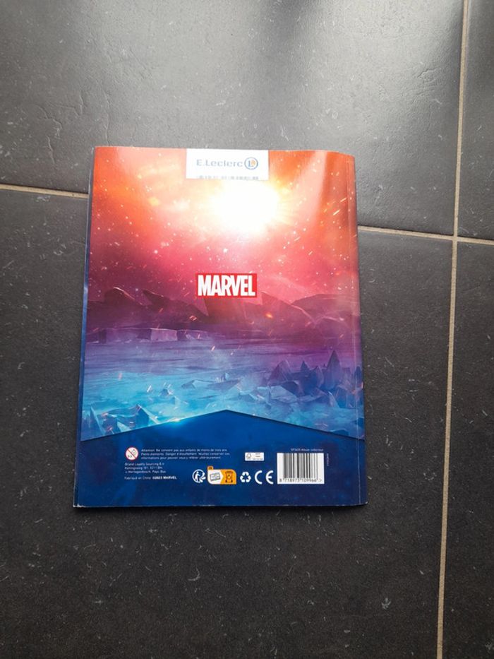 Livret collection cartes marvel leclerc. Manque 15 carte et page à la fin. Abîmé aux coins.