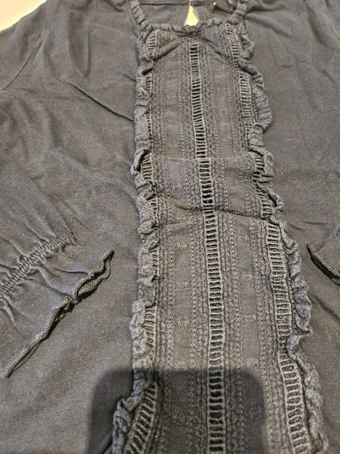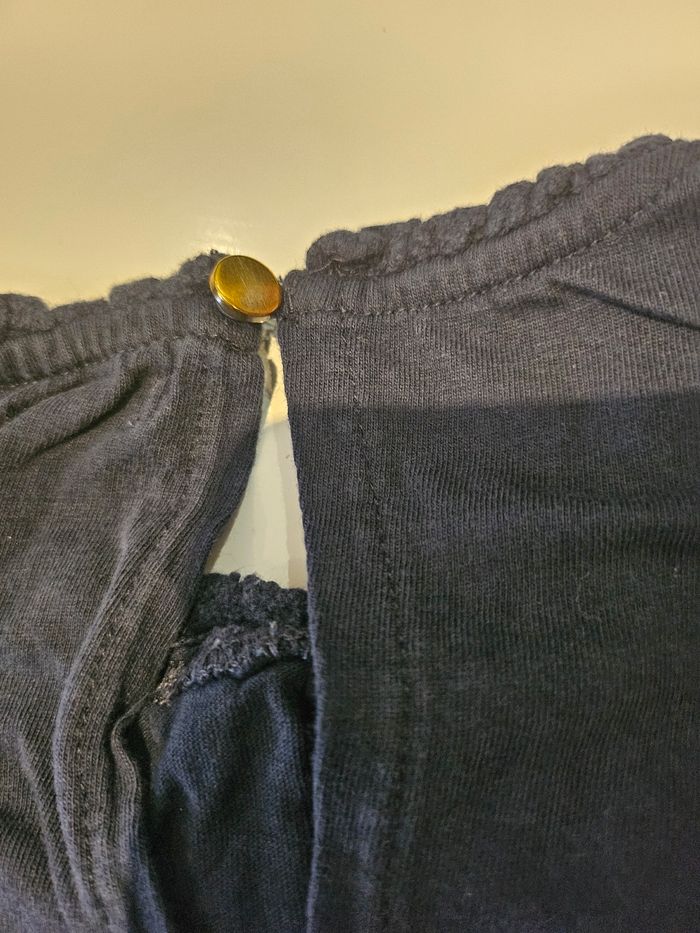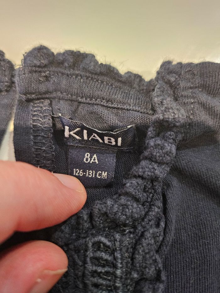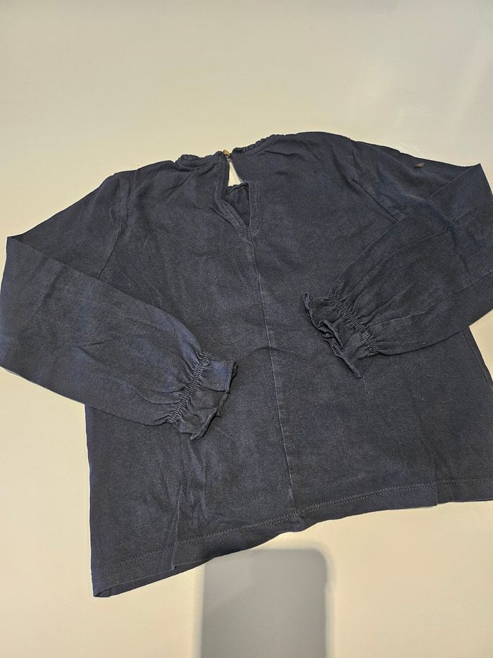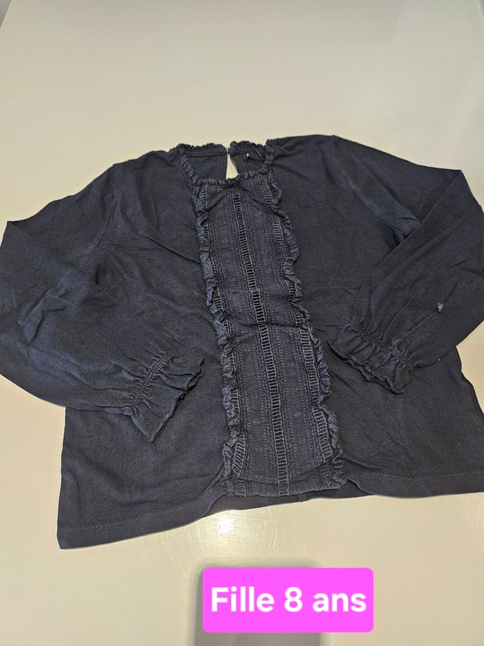 T-shirt manches longues bleu marine. Reserré bouts de manches. Details broderies devant. Petit bouton derrière. Marque : Kiabi Taille : 8 ans
