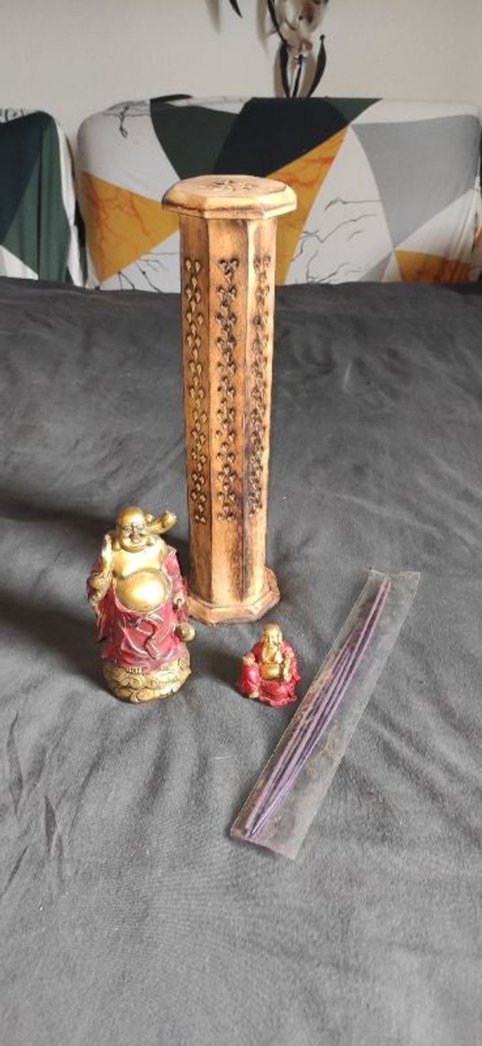 Je vends ce lot d'accessoires déco Zen: - un diffuseur d'encens en bois avec 5 bâtonnets d'encens. - deux figurine Bouddhas 8€ le lot