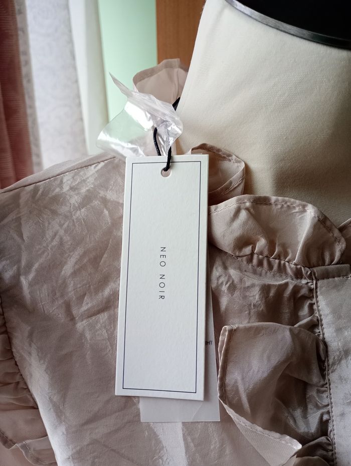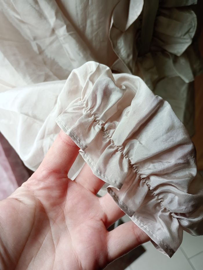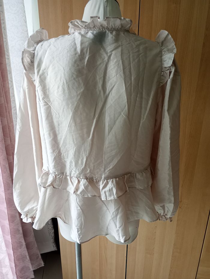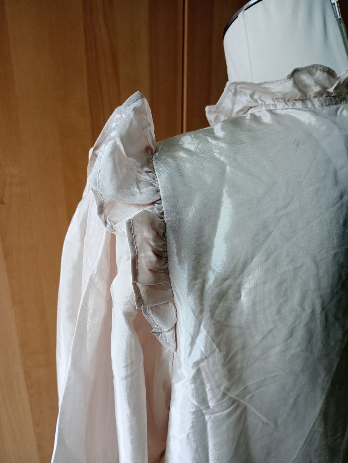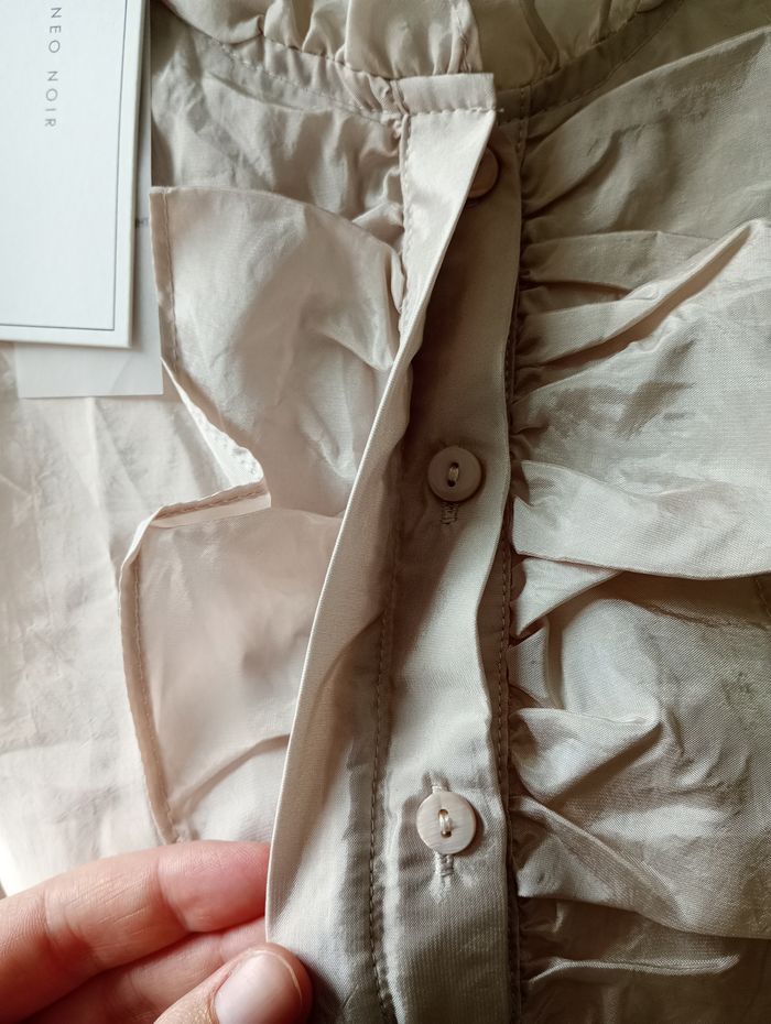 Blouse légère, ornée de jolis volants se le devant, aux épaules et à la taille. Tissu couleur crème, légèrement satinée. Fermeture par boutons invisibles. Style : Hawaï. 100 % polyester. Longueur : 60 cm. Largeur entre aisselles : 49 cm. Taille : 36. Marque : Neo Noir. Neuve avec étiquette.