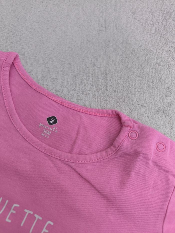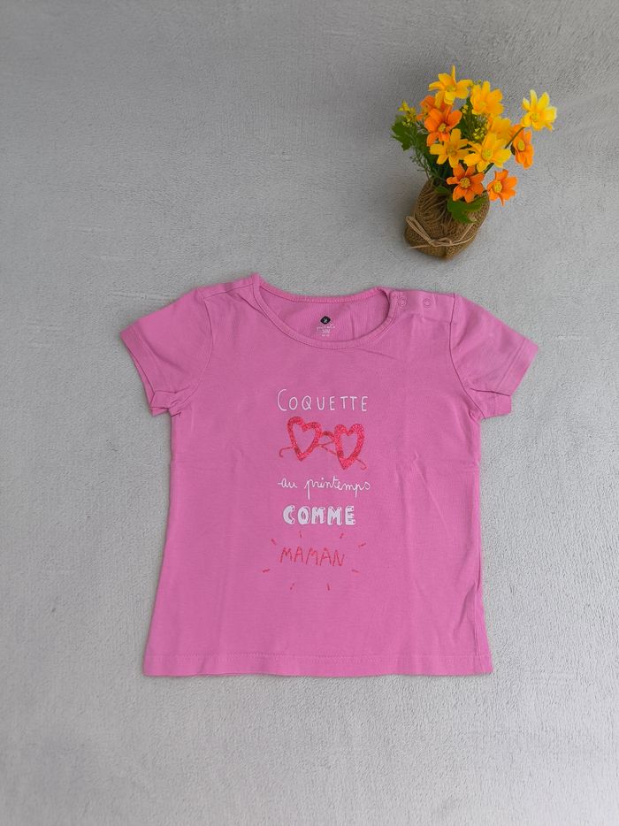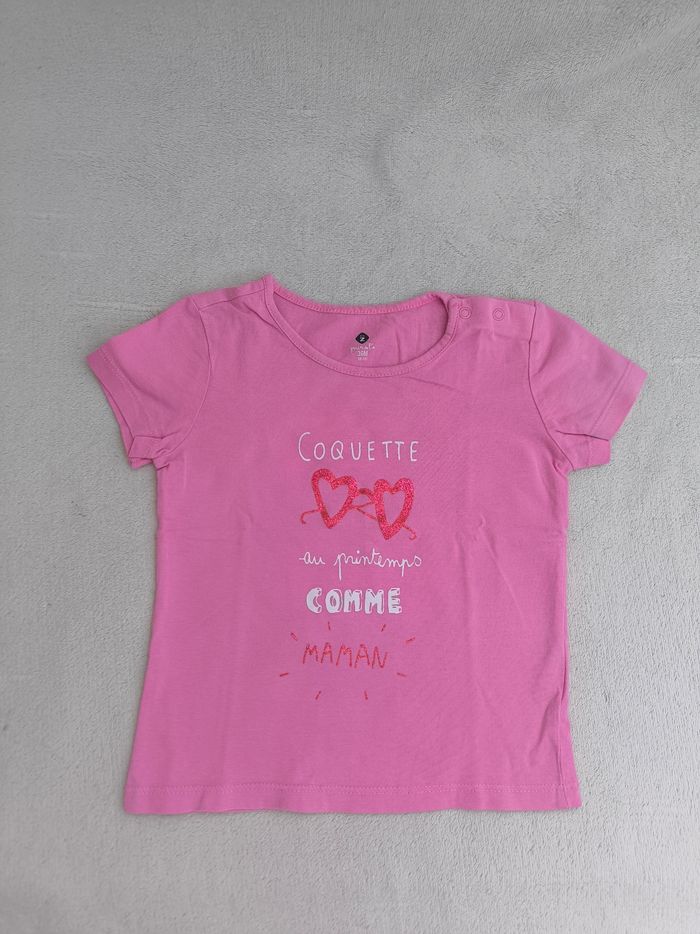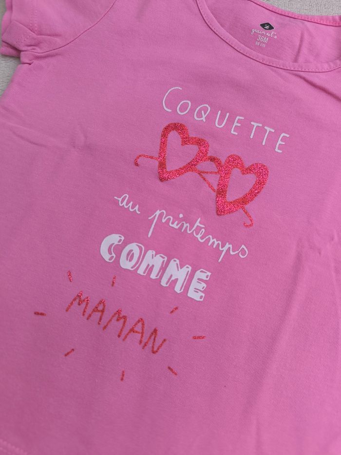 T-shirt à manches courtes Marque Grain de blé Taille 36 mois, 98 cm • Coloris rose, blanc • Inscription "Coquette au printemps comme maman", cœurs pailletés • Pressions au col • Coton fin • Petite tache sur une manche Peu porté, en très bon état #evelyne_filles_3ans #evelyne_filles
