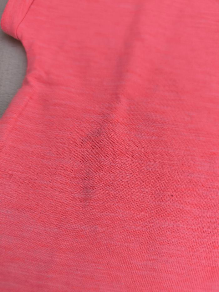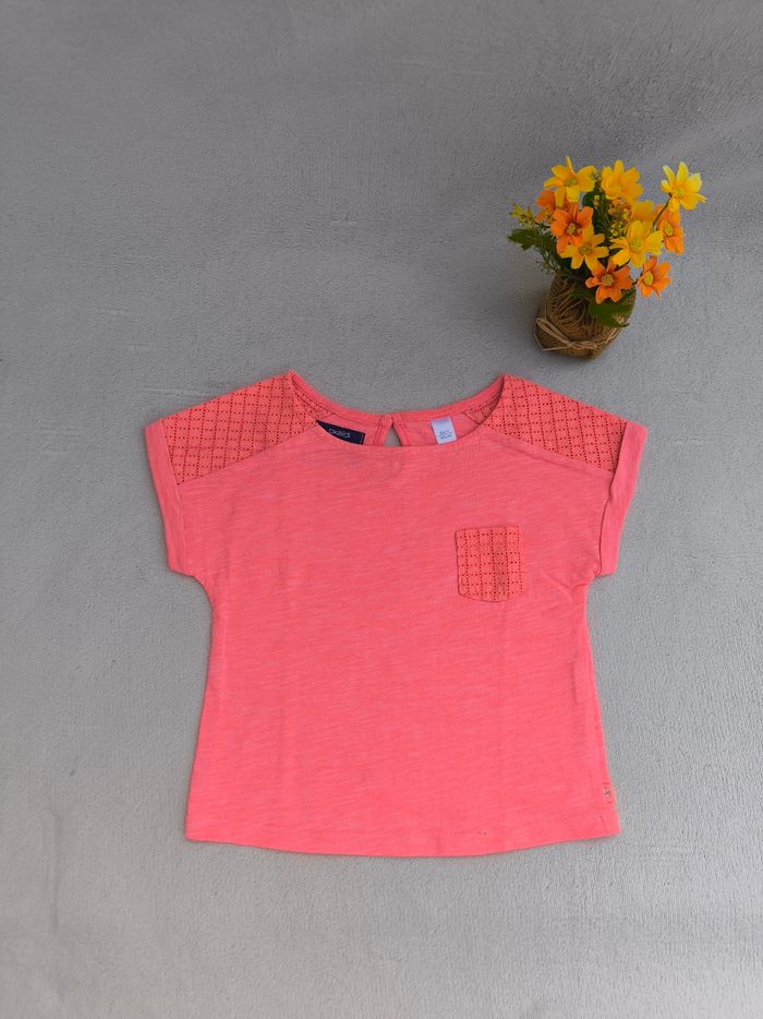 T-shirt à manches courtes Marque Okaïdi Taille 3 ans, 98 cm • Coloris rose • Poche supérieure • Broderie aux épaules • Tissu fin • Bouloché, petites taches En bon état #evelyne_filles_3ans #evelyne_filles
