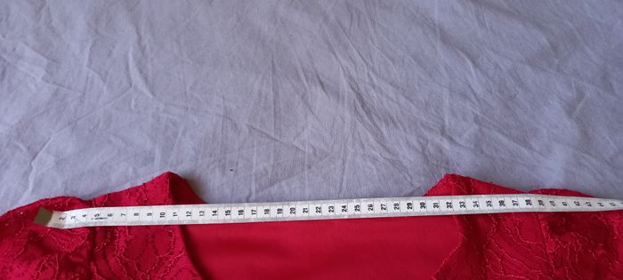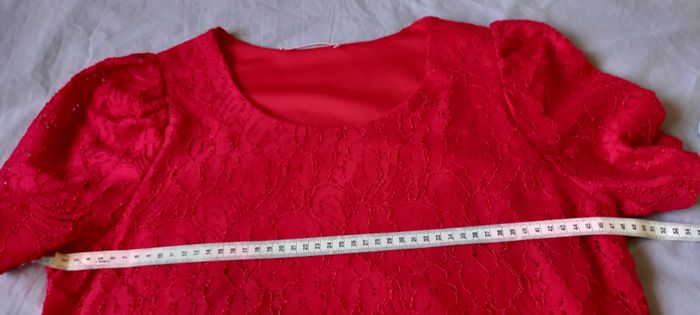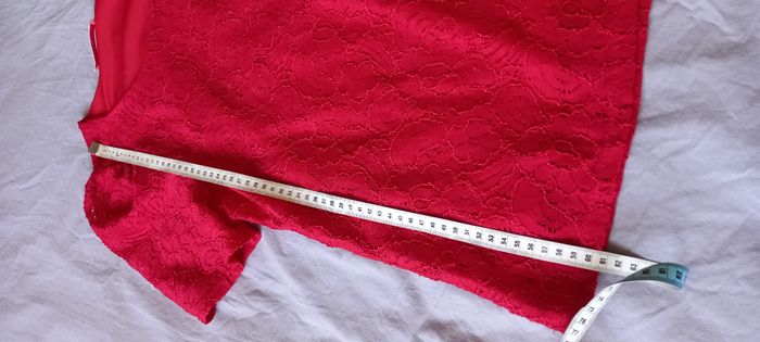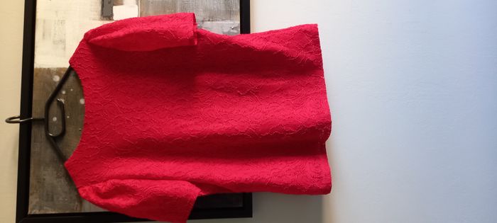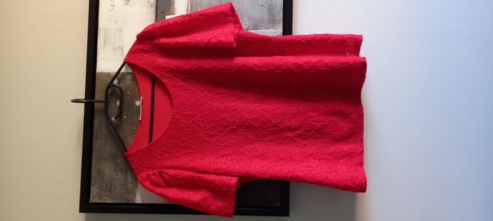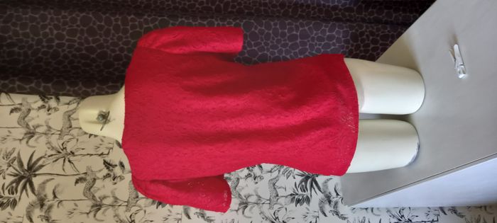 Haut rouge dentelle Camaïeu Manches courtes Entièrement doublé Etiquette coupée car génante Longueur 61 cm Largeur épaules 38 cm Largeur aisselles 49 cm Taille 38 #T38_imoddeco