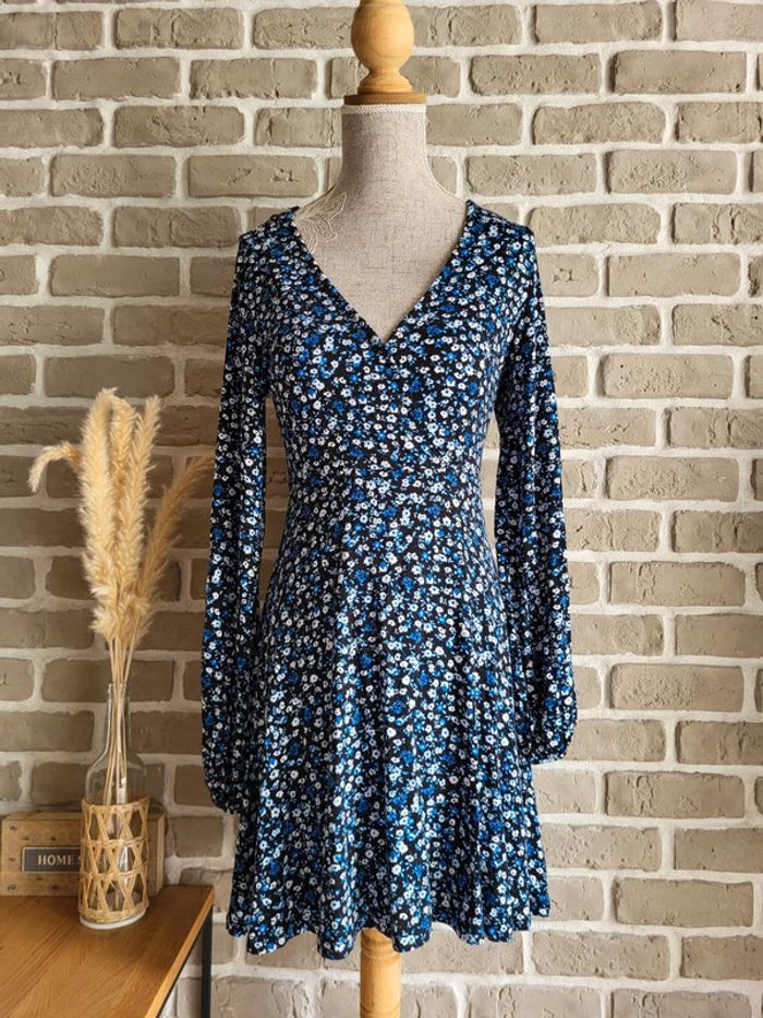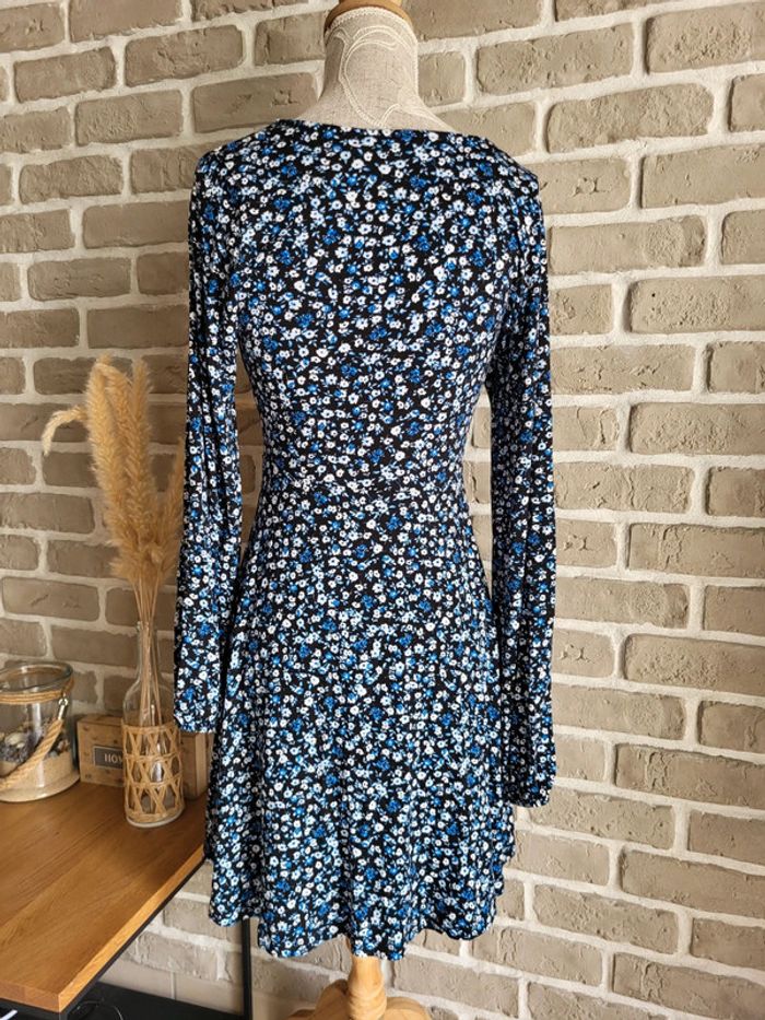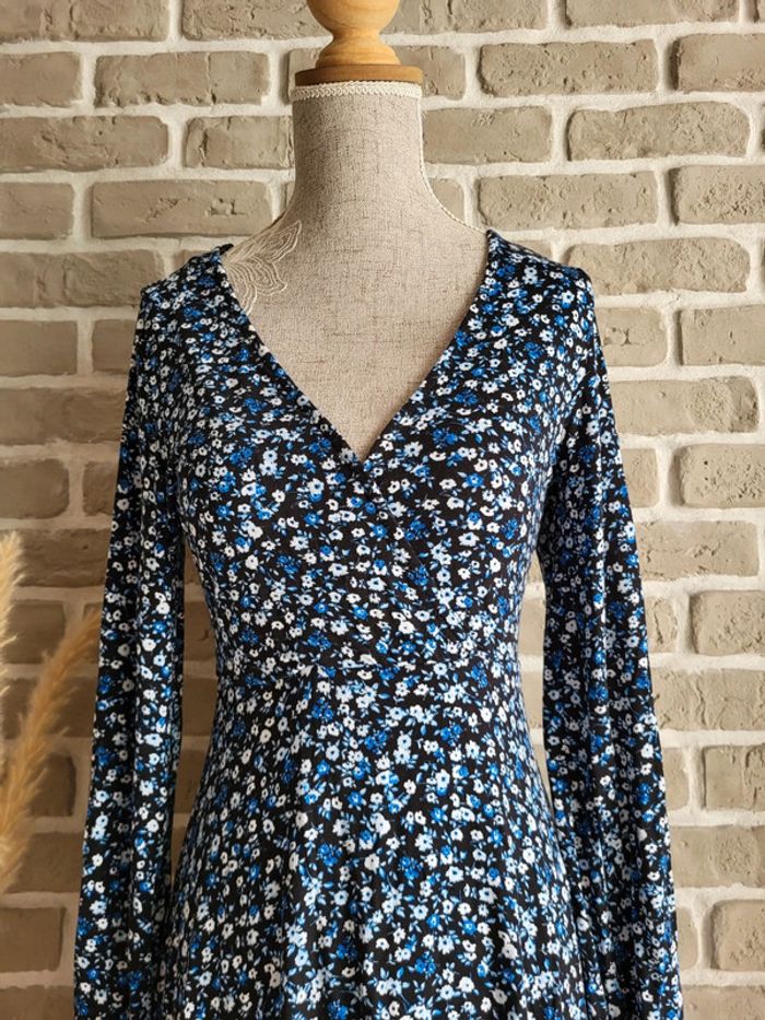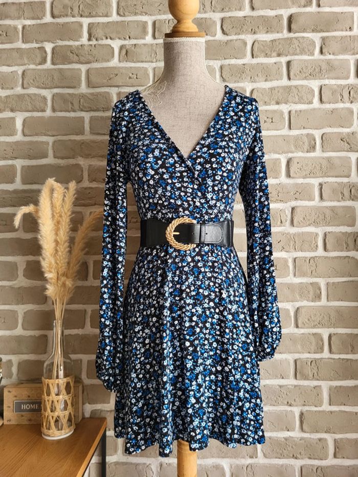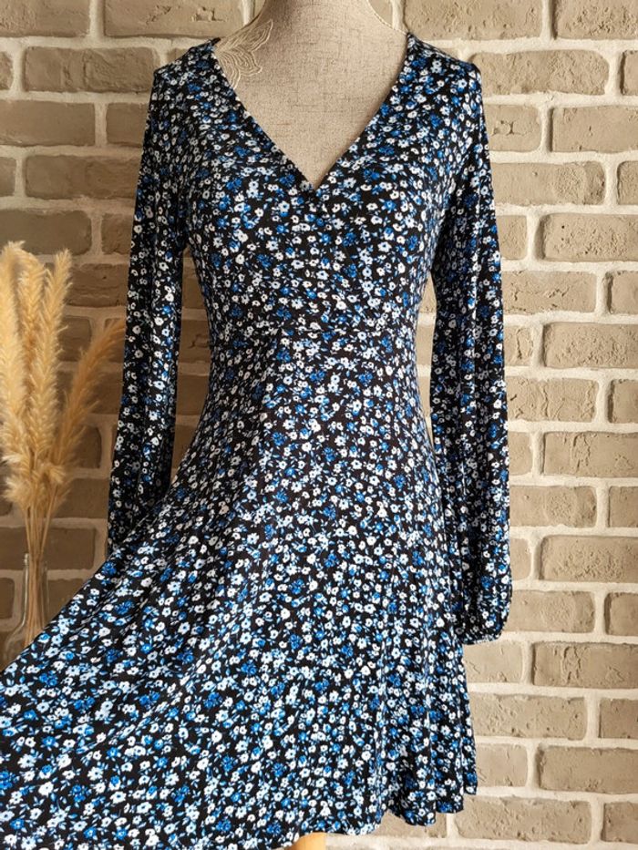 💝 Bénéficiez d'unet réduction en créant lot dans mon dressing 🛍️ 🌸 Jolie robe Stradivarius en très bon état, sans défaut 🎀 Tissu doux, fluide et extensible très agréable à porter Imprimé petites fleurs style liberty dans les tons bleus sur fond noir 🪷 Coupe patineuse avec décolleté croisé forme cache-cœur Effet drapé sur la partie jupe 🍥 Taille S 36 Longueur : 80 cm 🩷 À porter avec une large ceinture noire (non incluse) et des bottines pour un look romantique chic, ou seule avec des baskets et une veste en jean pour un look casual un peu bohème