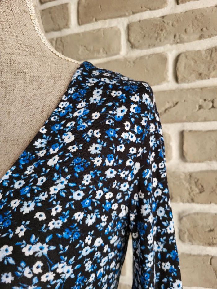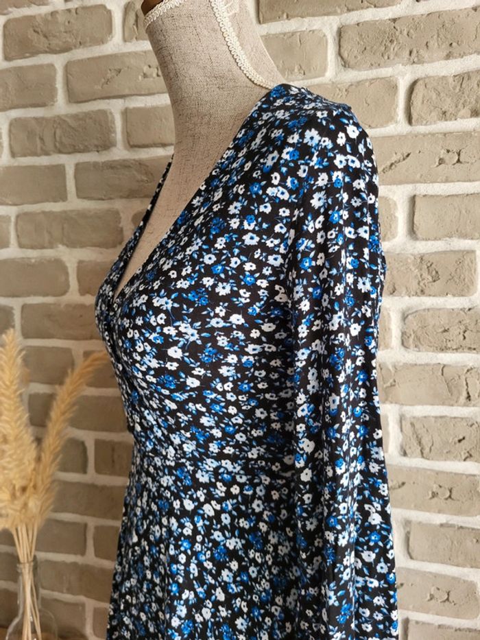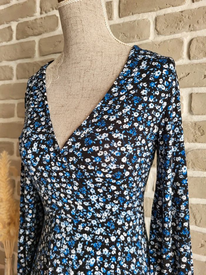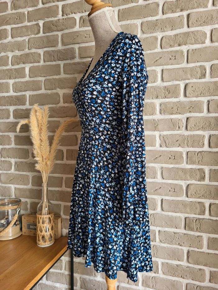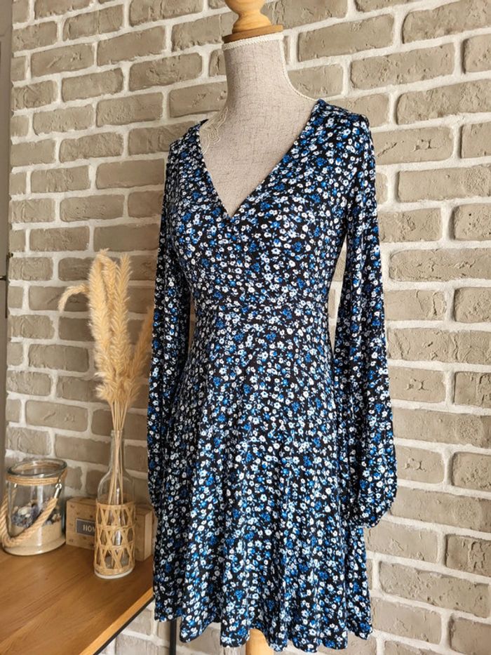 💝 Bénéficiez d'unet réduction en créant lot dans mon dressing 🛍️ 🌸 Jolie robe Stradivarius en très bon état, sans défaut 🎀 Tissu doux, fluide et extensible très agréable à porter Imprimé petites fleurs style liberty dans les tons bleus sur fond noir 🪷 Coupe patineuse avec décolleté croisé forme cache-cœur Effet drapé sur la partie jupe 🍥 Taille S 36 Longueur : 80 cm 🩷 À porter avec une large ceinture noire (non incluse) et des bottines pour un look romantique chic, ou seule avec des baskets et une veste en jean pour un look casual un peu bohème