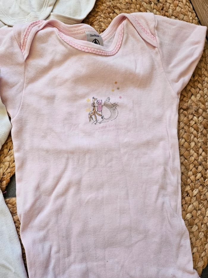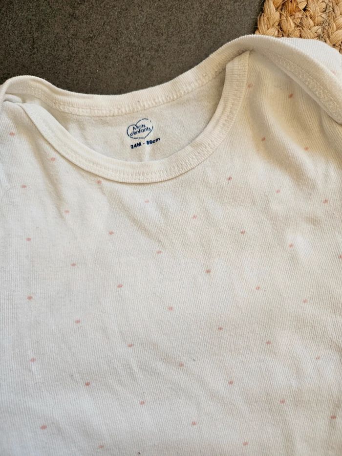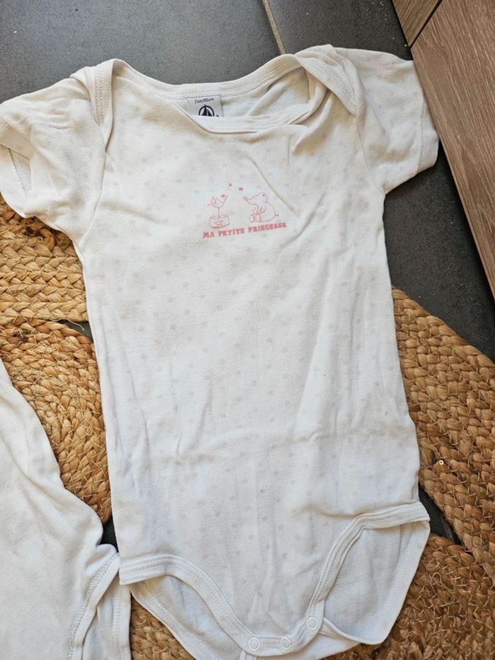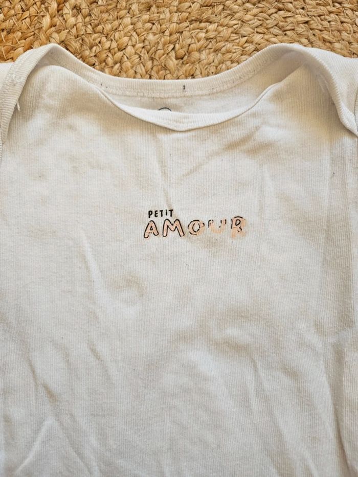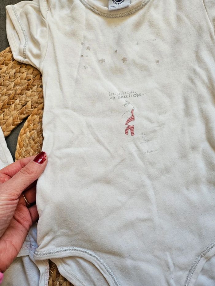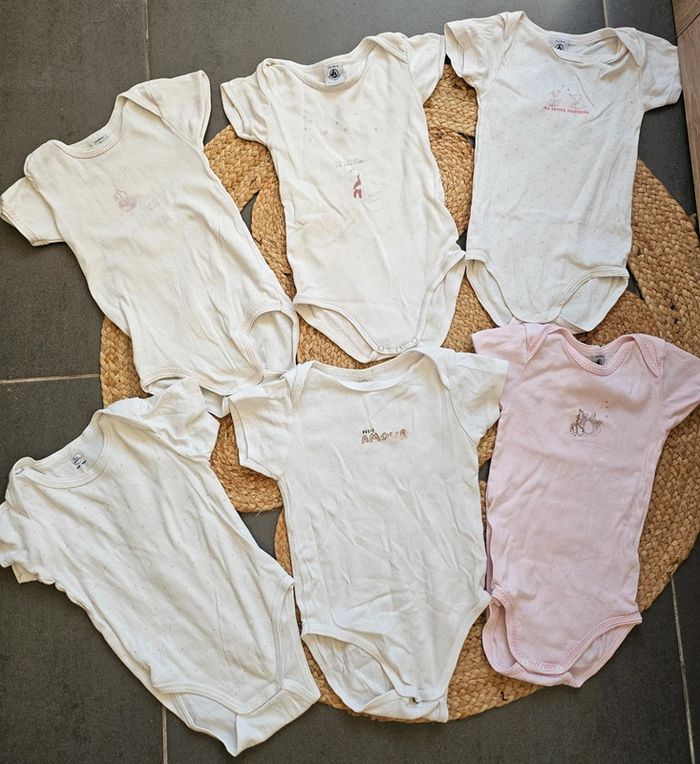 Lot de 6 bodies manches courtes 4 bodies petit bateau 2 bodies mots d'enfants Certains présentent qlqs tâches (voir sur les photos) Bon état général 2€50 le lot #bodies24moismanchescourtes #bodies24moisfille