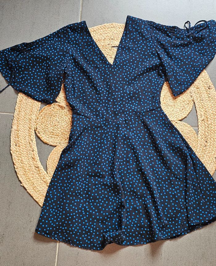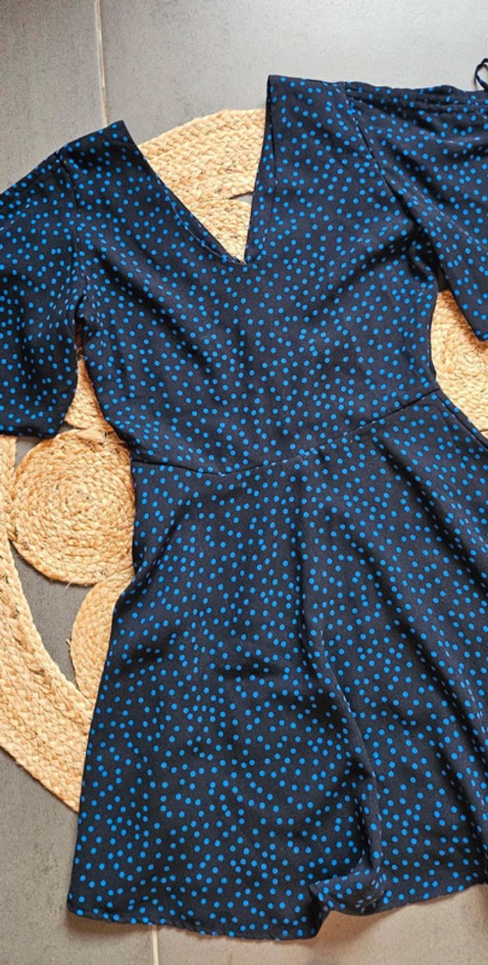 Jolie robe noire a pois bleus Manches courtes Fermeture éclair Col V avant et arrière Mango Taille 36 En très bon état 3€50 #robemango36femme #robemango #robe36femme