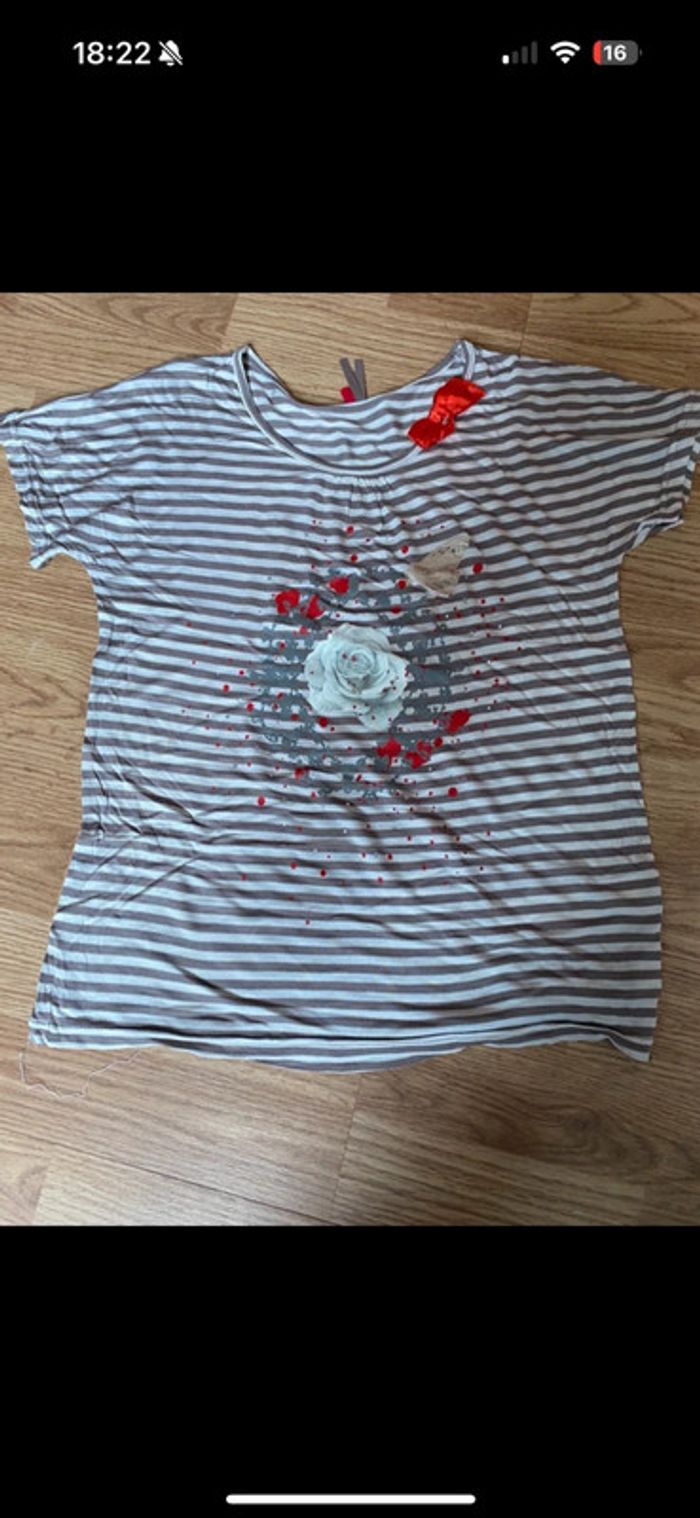 T-shirt orchestra 14 ans Rayé blanc et gris avec fleur et papillons et motifs rouge Impeccable Réduction si lot #amandinefille14ans