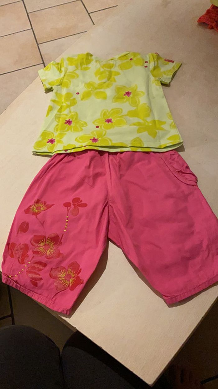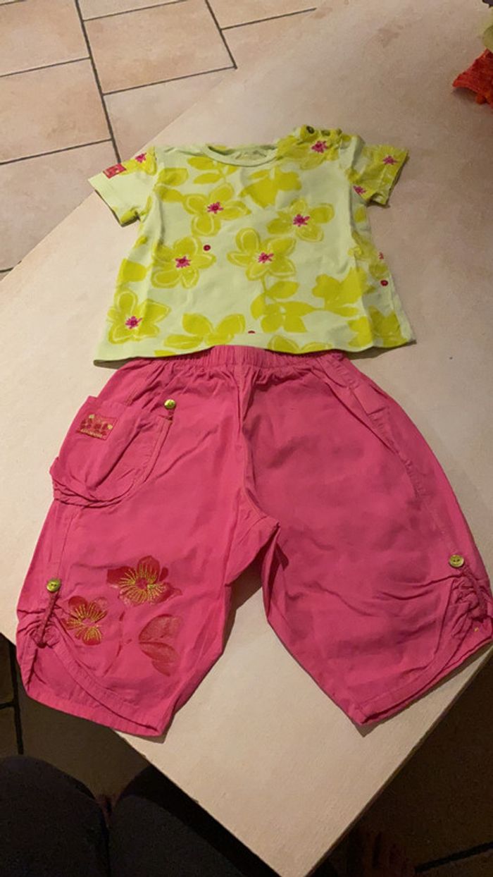 Ensemble Marese Bébé fille 6 mois -Pantalon rose avec fleur -T-shirt vert et rose Très bon état #amandinefille6mois