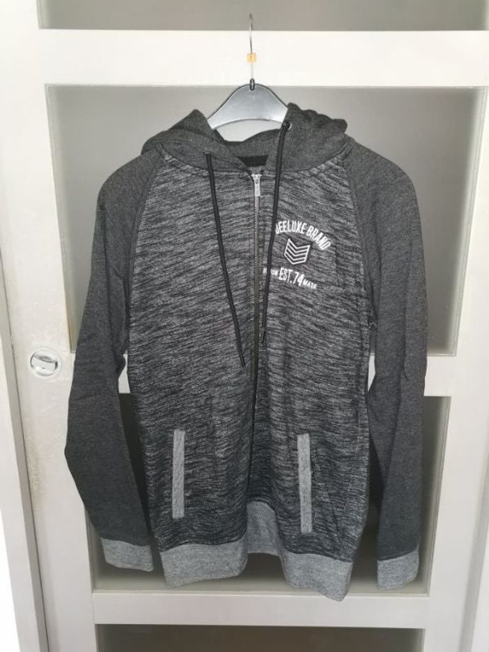 Sweat zippé Deeluxe 74 taille M , à capuche , noir/gris chiné , excellent état . N'hésitez pas à me demander d'autres photos ou infos complémentaires et à consulter mes autres ventes .
