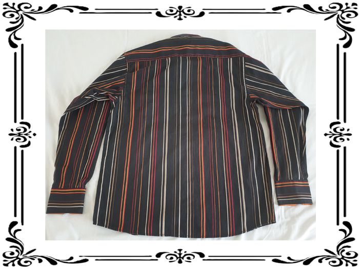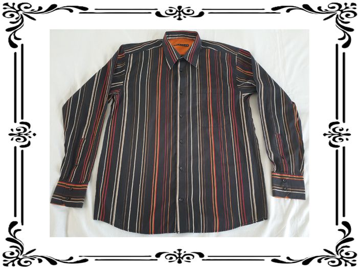Chemise taille XL. Chemise manches longues noire avec rayures multicolore. Une poche poitrine. Tour de col : 40 cm Largeur d’épaule à épaule : 47 cm Largeur sous les bras : 53 cm Longueur totale : 73 cm Longueur des manches : 61,5 cm En très bon état. Brice. 3,00€. #vero38110vetementshomme42