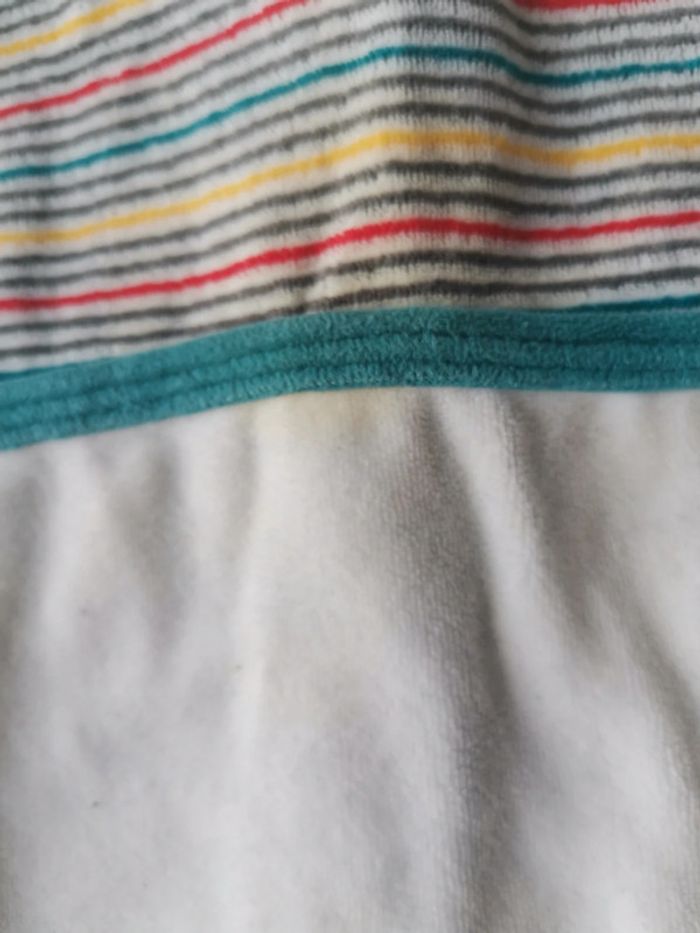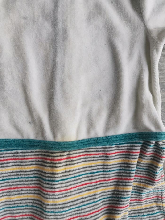 Lot de 3 pyjamas velours. Bon etat general mais : le rayé présente plusieurs taches jaunes cf photo. Sur le bleu motifs qui montrent quelques signes d'usure. Le 3 ème très légèrement jauni au col.