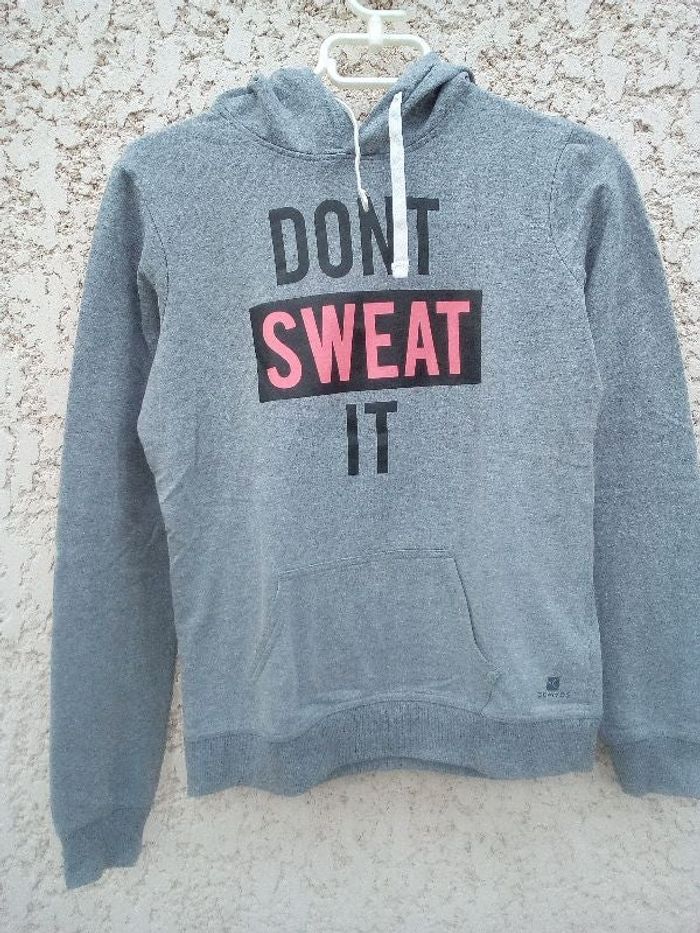 Sweat avec capuche. Inscription sur le devant "dont sweat it". Marque Décathlon, taille XS.